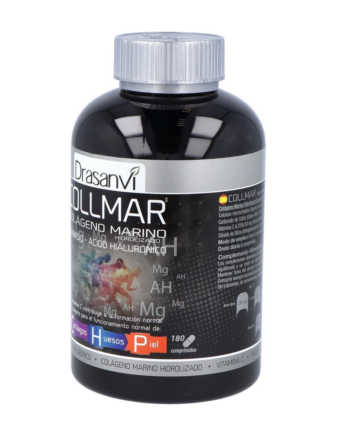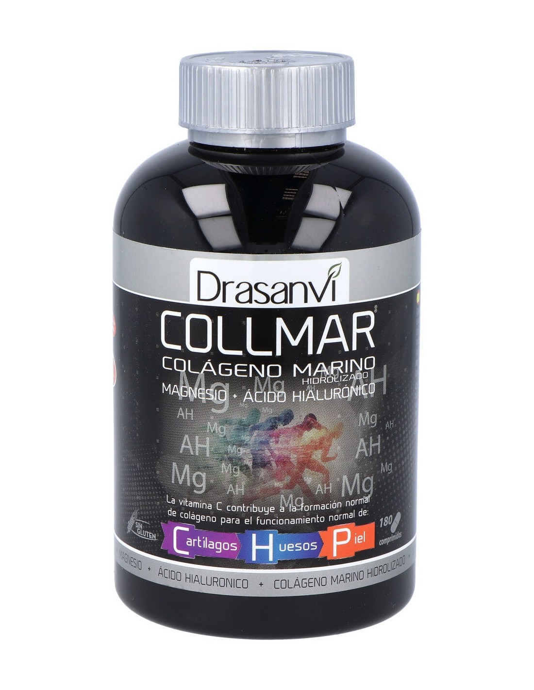 Collmar es un complemento alimenticio de Drasanvi que contribuye a la formación normal de colágeno para fortalecer los cartílagos, huesos y piel. Enriquecido con magnesio y colágeno marino hidrolizado, además de llevar ácido hialurónico, magnesio, calcio y Vitamina C (una perfecta combinación para el mantenimiento de los huesos y músculos en condiciones normales.