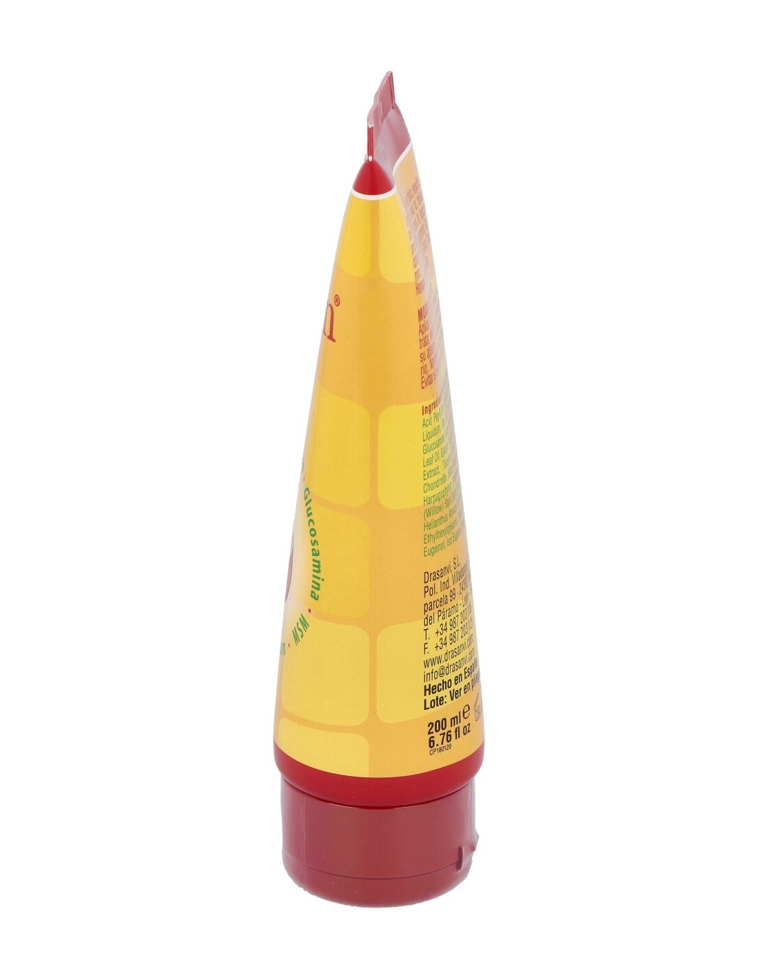 INCI: Aqua, Dimethyl Sulfone, C12-20 Acid PEG-8 Ester, Caprylic/capric Triglyceride, Paraffinum Liquidum, Oleic Acid, Cetyl Alcohol, Urea, Lanolin, Glucosamine Sulfate, Dimethicone, Propylene Glycol, Eugenia Caryophyllus Bud Oil, Eugenol, Arnica Montana Flower Oil, Tocopheryl Acetate, Phenoxyethanol, Chondroitine Sulfate Marine, DMDM Hydantoin, Capsicum Frutescens Resin, Harpagophytum Procumbens Root Extract, Salix Alba Bark Extract, Symphytum Officinale Root Extract, Arnica Montana Flower Extract, Isoeugenol, Limonene, Linalool.