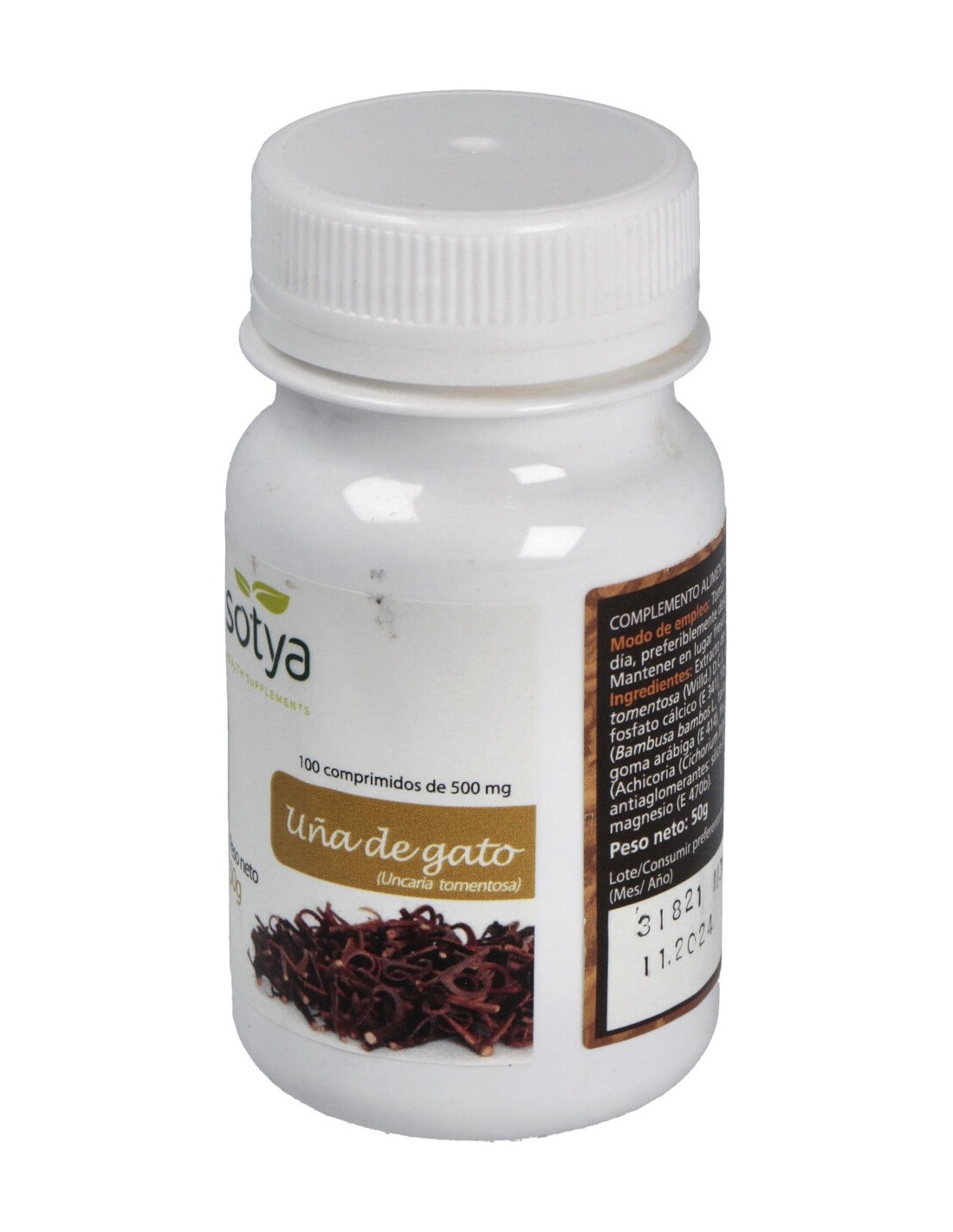100 comprimidos de 500mg con 200mg de uña de gato (Uncaria tomentosa), 60mg de extracto estandarizado equivalente a 450mg de planta. Excipientes: fosfato dicálcico, fructooligosacáridos y estearato de magnesio.