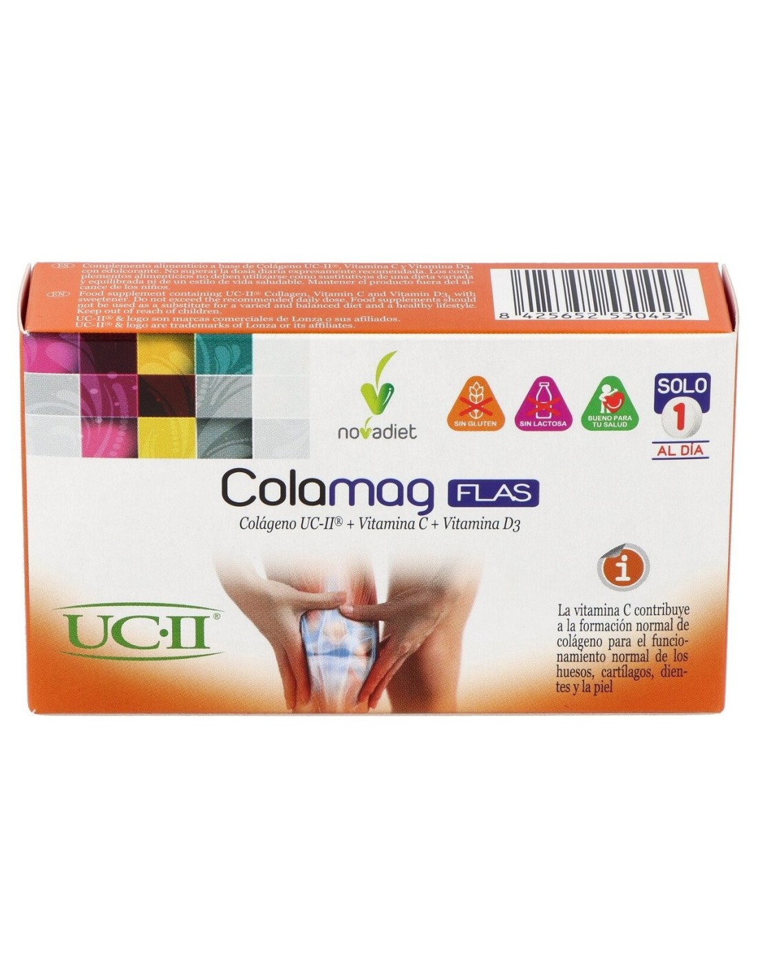 Colamag Flas Novadiet 30comp es un complemento alimenticio que ayuda a proteger las articulaciones y contribuye a regenerar el cartílago articular. Contiene colágeno UC-II®, que ayuda a regenerar el cartílago articular dañado y contribuye a la formación de huesos, tendones y ligamentos. La vitamina D3, por su parte, contribuye a la absorción y utilización normal del calcio y el fósforo, mientras que la vitamina C fomenta la formación normal del colágeno y protege a las células del daño oxidativo.