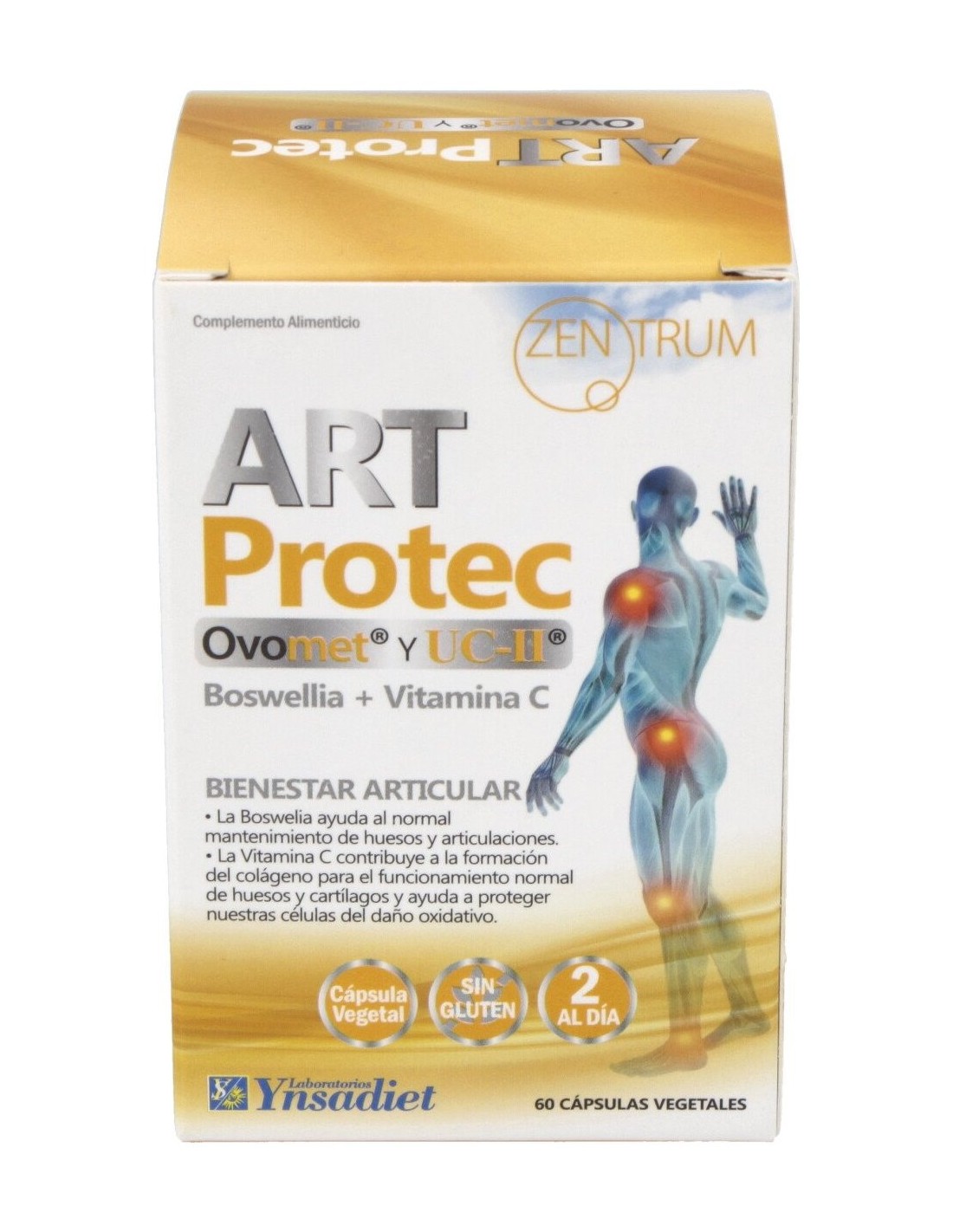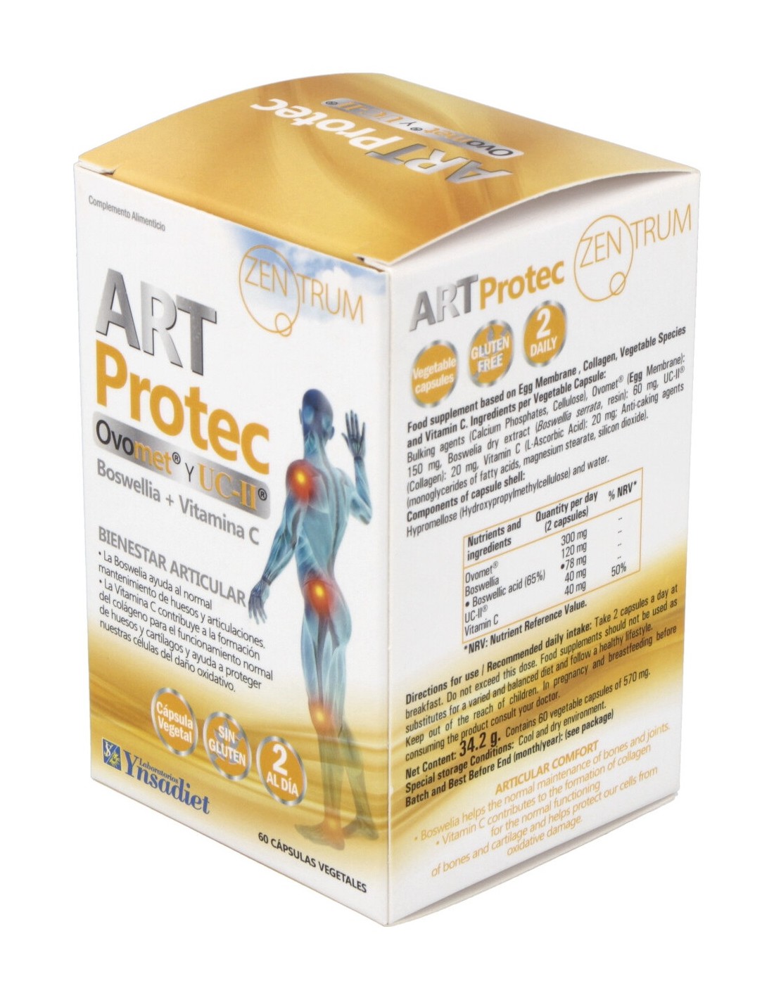 Agentes de carga (Fosfato dicálcico, Celulosa), Ovomet® (Membrana de Huevo): 150 mg, Boswelia extracto seco (Boswellia serrata, resina): 60 mg, UC II® (Colágeno): 20 mg, Vitamina C (Ácido L-Ascórbico): 20 mg: Antiaglomerantes (Monoglicéridos de ácidos grasos, Estearato de magnesio, Dióxido de silicio). Componentes de la cubierta de la cápsula: Hipromelosa (hidroxipropilmetilcelulosa) y agua.