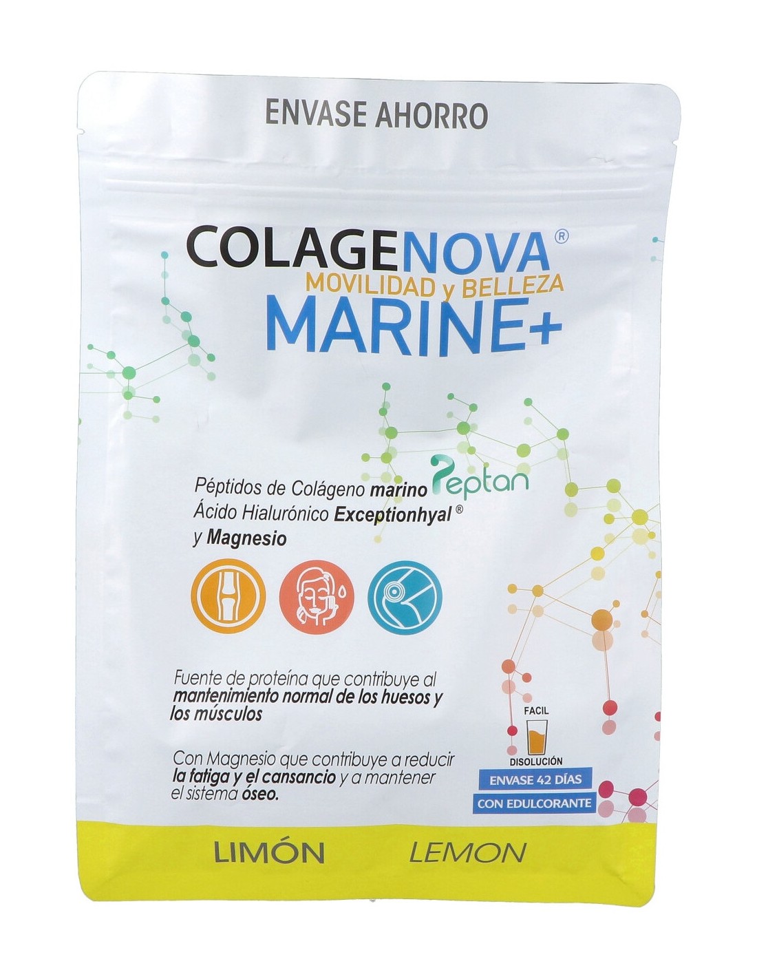 Complemento alimenticio a base de péptidos de colágeno hidrolizado puro procedentes de pescado con ácido hialurónico de origen vegetal y gluconato de Magnesio. Contribuye al mantenimiento del sistema óseo y muscular.