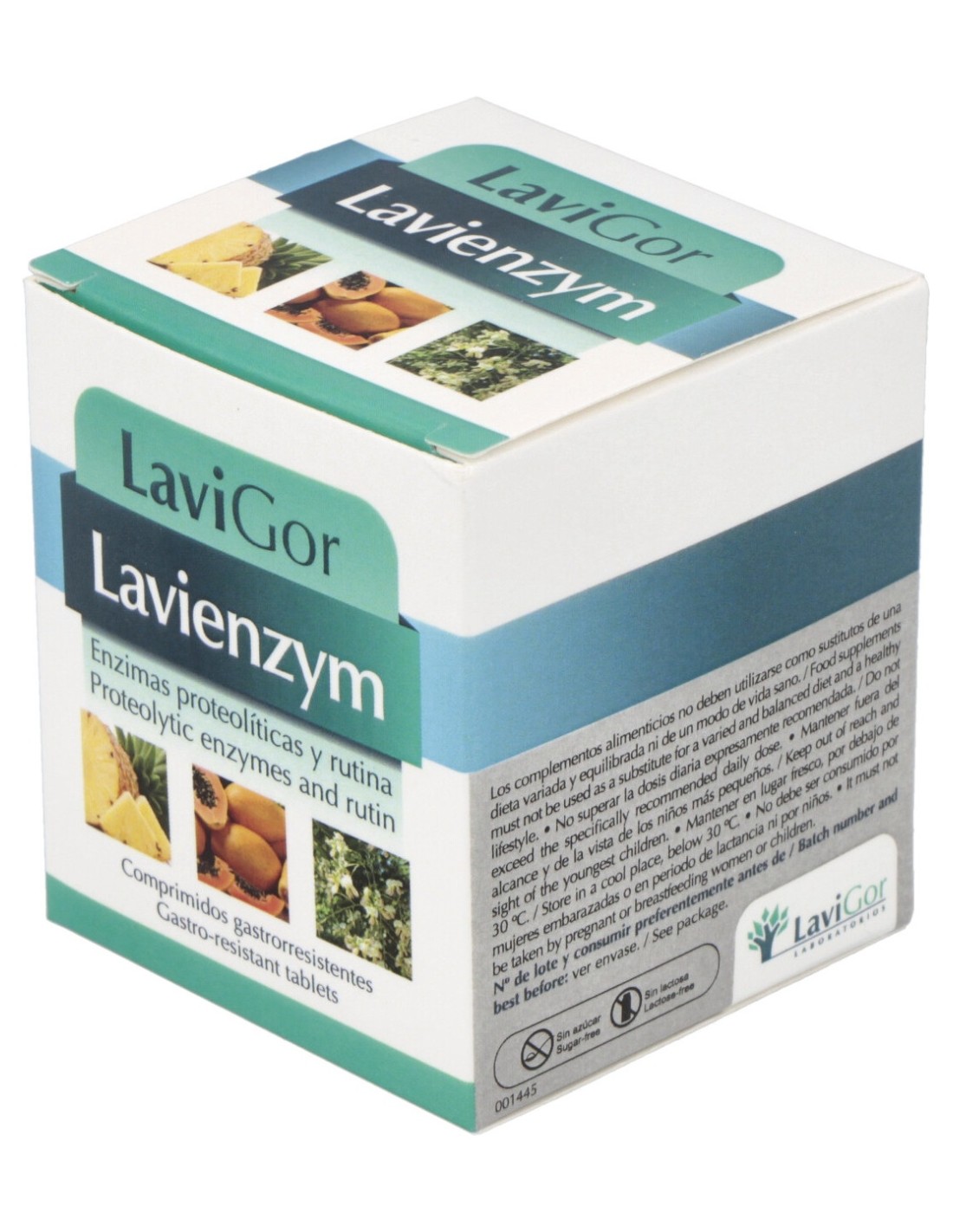 Pancreatina, 100 mg: papaína, 60 mg: rutina, 50 mg: bromelina, 45 mg: tripsina, 24 mg: lipasa, 10 mg: amilasa, 10 mg: quimiotripsina, 1 mg.