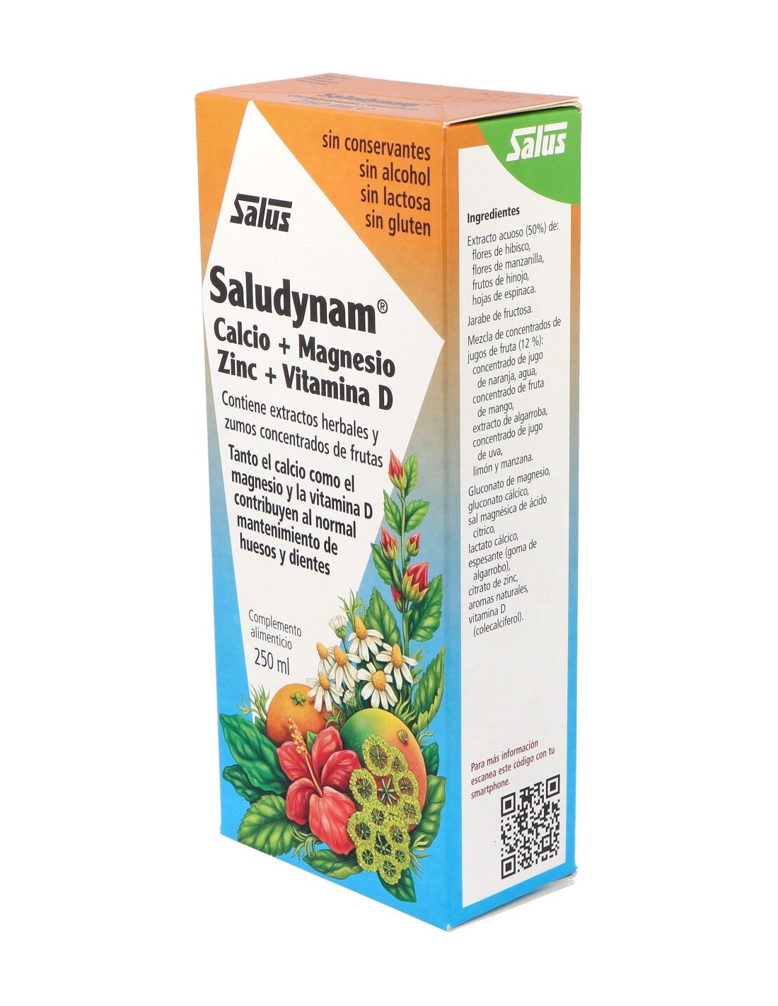 Extracto acuoso (50%) de: flores de hibisco, flores de manzanilla, frutos de hinojo, hojas de espinaca. Jarabe de fructosa. Mezcla de concentrados de jugos de fruta (12%): concentrado de jugo de naranja, agua, concentrado de fruta de mango y uva, extracto de algarroba, concentrado de jugo de manzana y limón. Gluconato de magnesio, gluconato cálcico, sal magnésica de ácido cítrico, lactato cálcico, espesante (goma de algarrobo), citrato de zinc, aromas naturales, vitamina D.