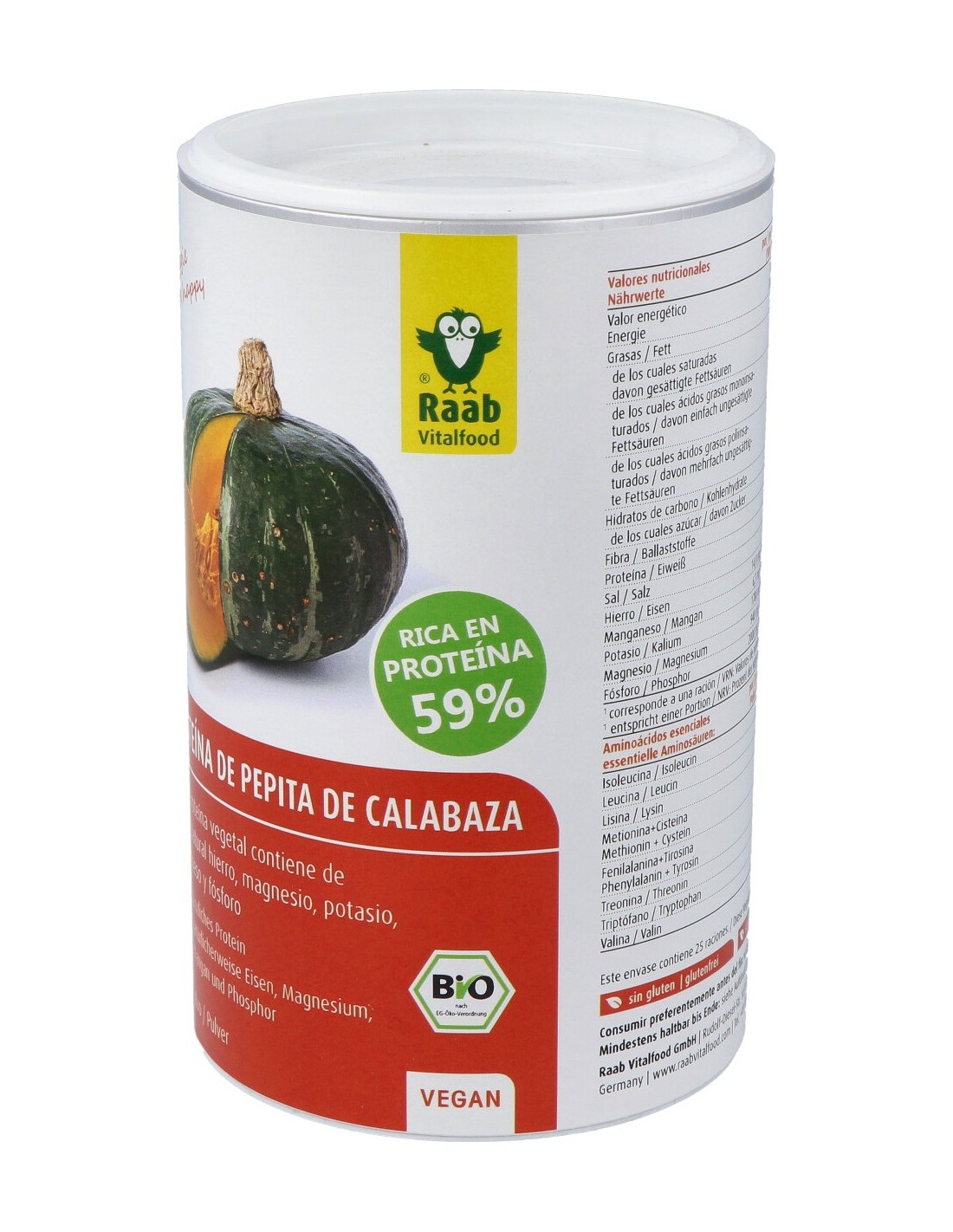 100 % harina de pepita de calabaza, semidesgrasada* (99,8 % pepitas de calabaza asadas*, sal)