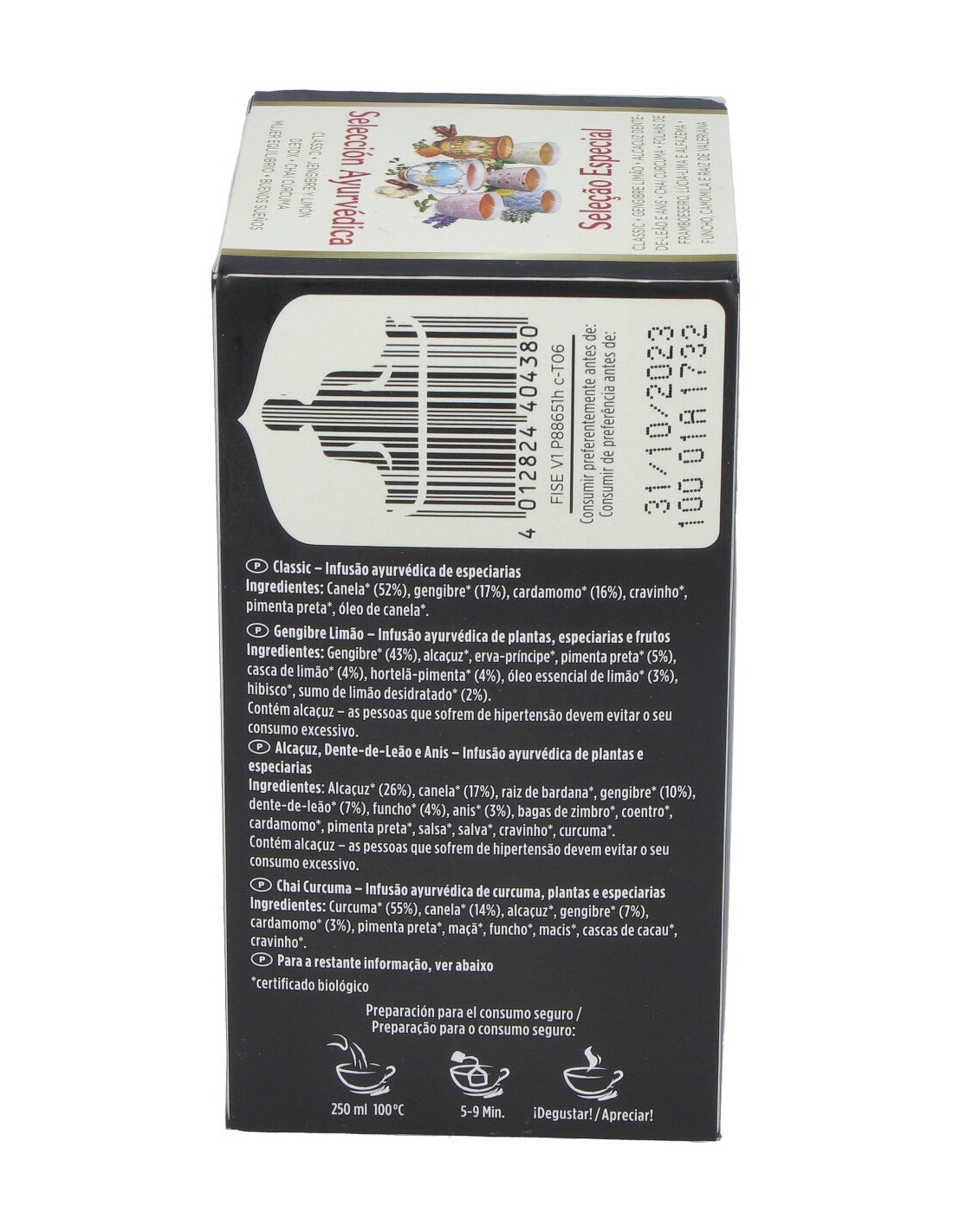 Selección de distintas variedades para infusión. Contiene 3 bolsitas para infusión de 6 de sus variedades. Contiene 3 bolsitas de Classic, Jengibre y Limón, Detox, Chai cúrcuma, Mujer equilibrio y Buenos sueños.