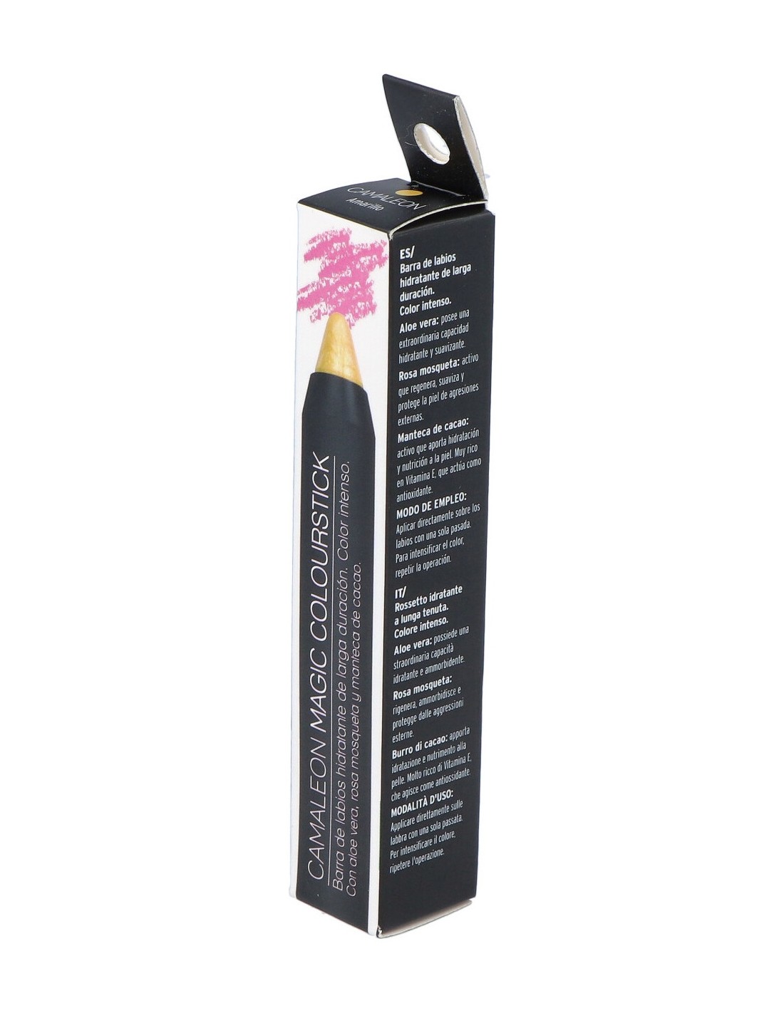 Camaleon ofrece la gama Magic Colour, formada por unos lápices labiales de colores intensos y vivos. En esta ocasión, la tonalidad amarillo intenso N1 es la elegida, cuya composición ha sido enriquecida con aloe vera, rosa mosqueta y manteca de cacao.