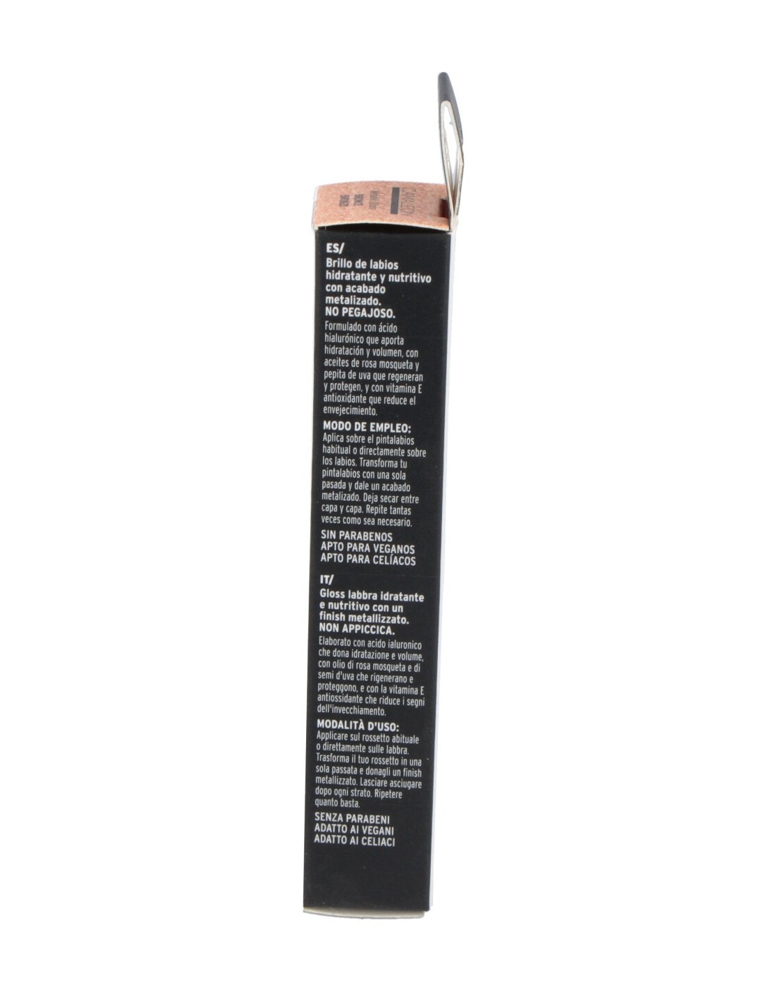 Brillo de labios con ácido hialurónico. No pegajoso, con aceites naturales y vitamina E para nutrir e hidratar. Producto apto para veganos y celíacos.