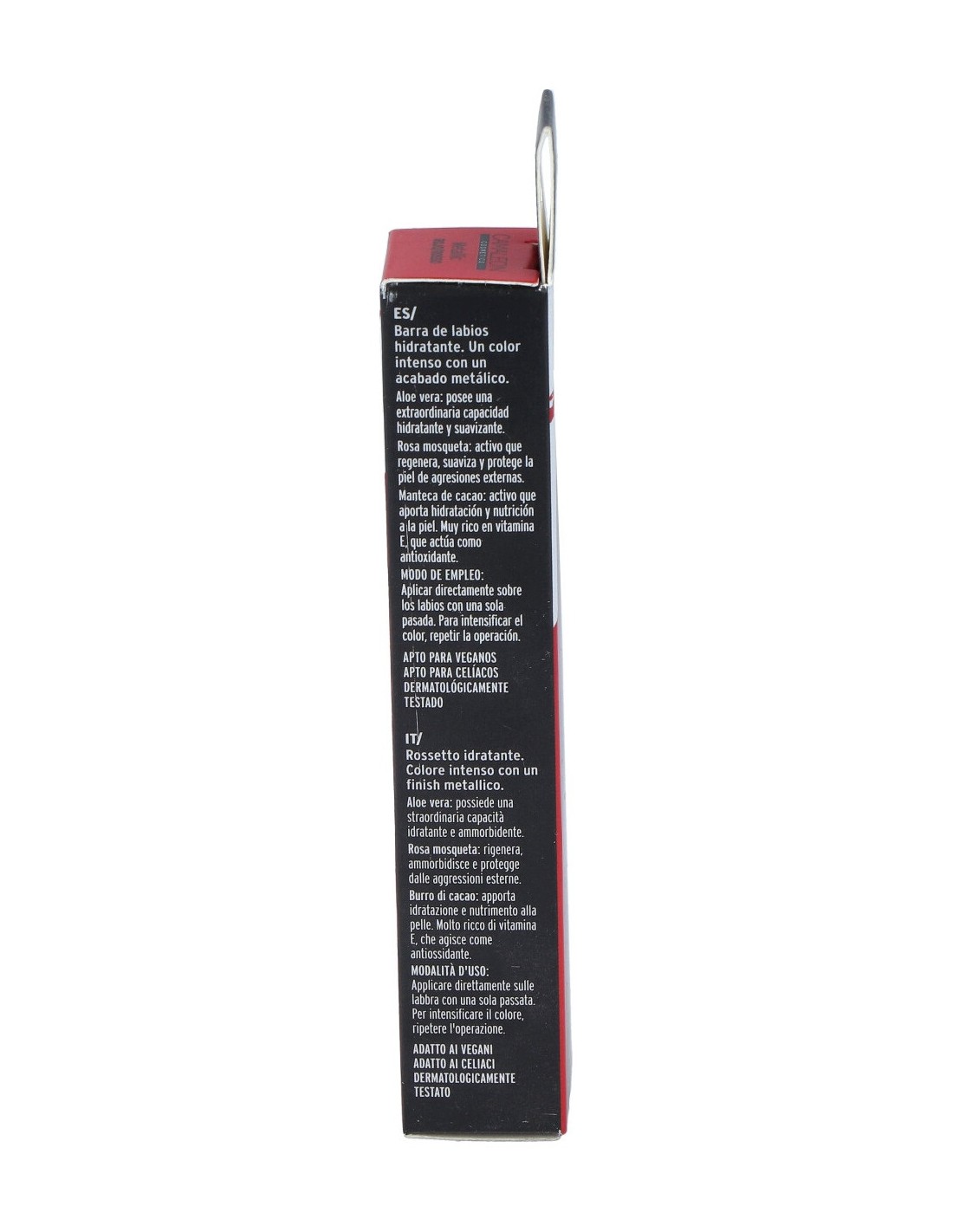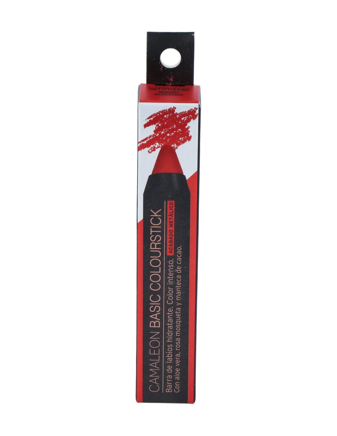 Esta barra de labios rojo metálico de Camaleon cuenta con una alta concentración de pigmentos y emolientes. El color dura alrededor de 12 horas, al mismo tiempo que hidrata y nutre los labios. Su composición es a base de aloe vera, rosa mosqueta y manteca de cacao. Contiene antioxidantes, vitaminas y proporciona un efecto rejuvenecedor para la delicada piel de los labios. La composición de su fórmula otorga un color único a cada persona. Es de textura cremosa, lo que permite que su aplicación sea sencilla y uniforme.