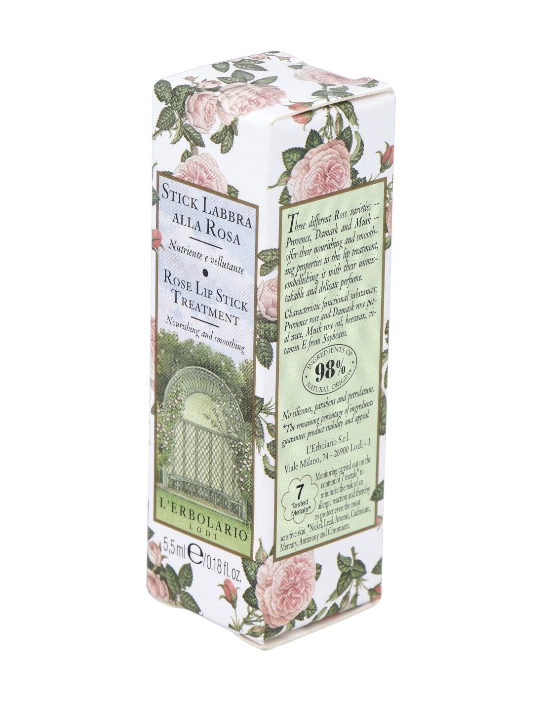 Tres variedades diferentes de rosa -centifolia, damascena y mosqueta- ofrecen sus propiedades nutritivas y aterciopeladas a este tratamiento labial con su inconfundible y delicado aroma.