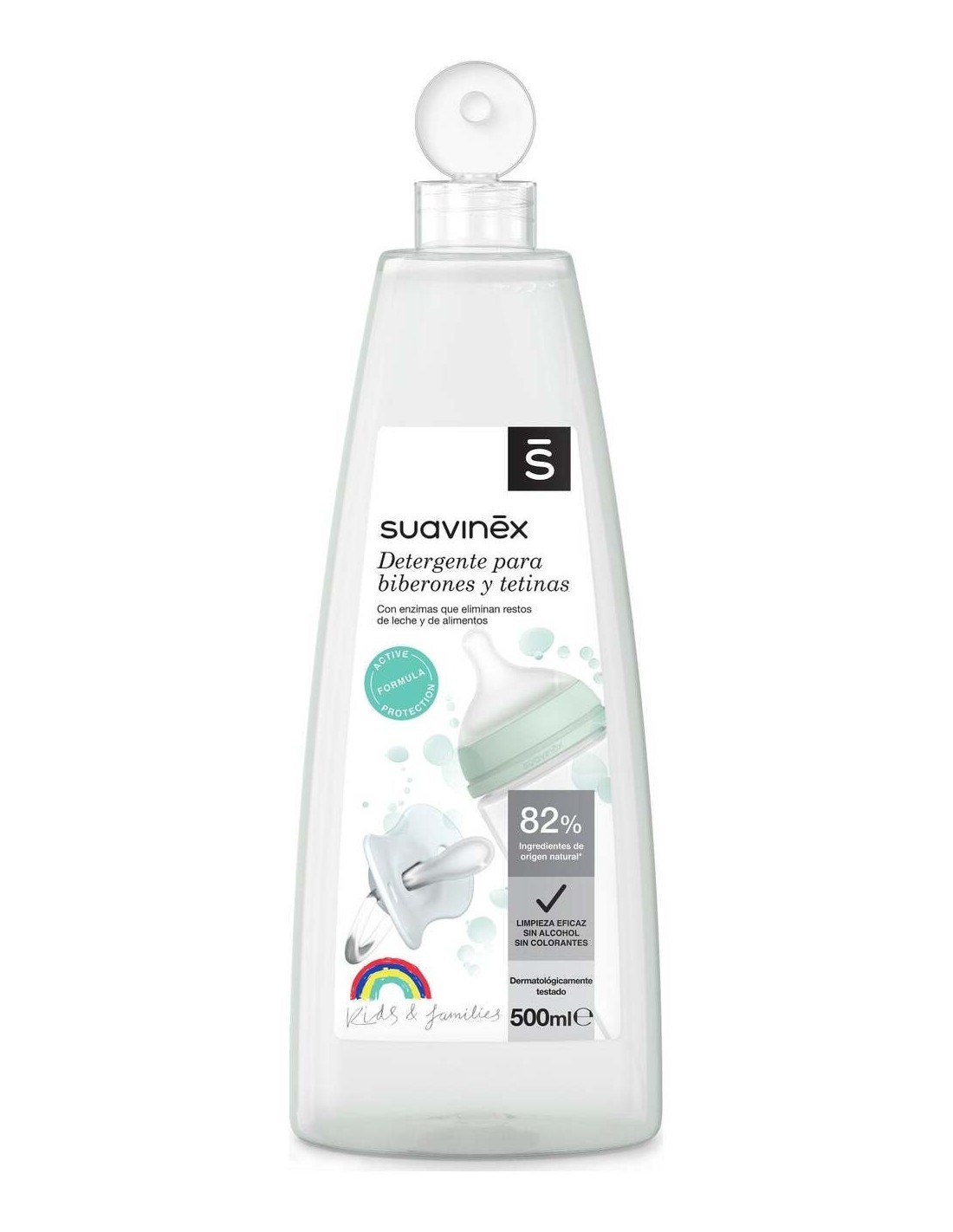 Detergente para biberones y tetinas, limpia en profundidad los restos de leche, papilla y zumo, así como los restos de comida de la vajilla infantil (platos, tazas, cubiertos).