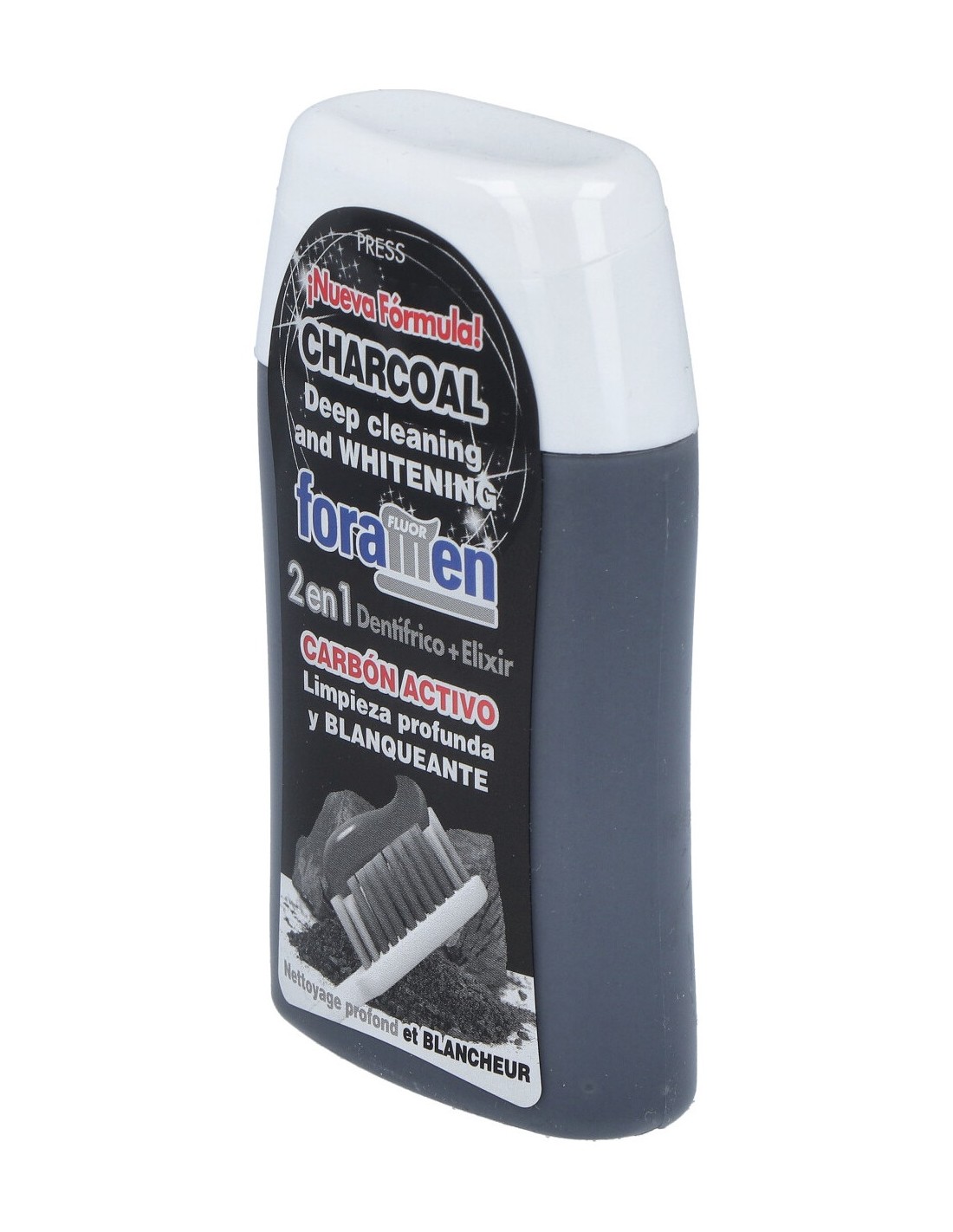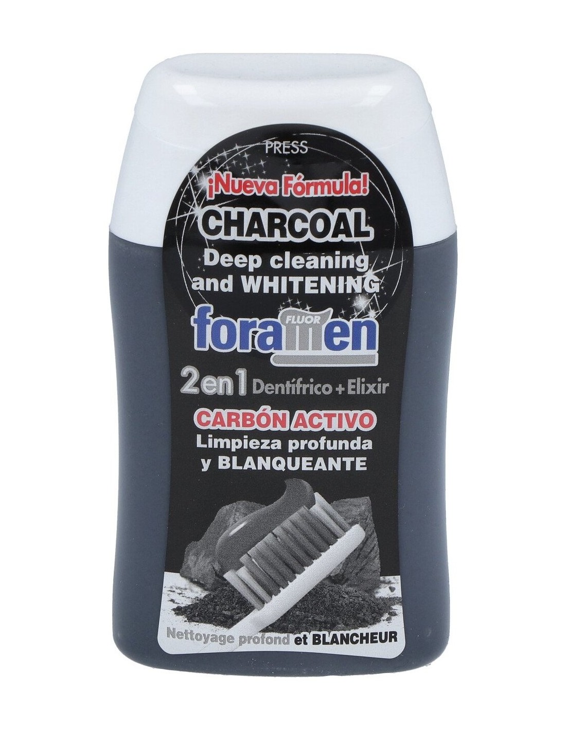 Fórmula 2 en 1 combinación de dentífrico+elixir. Eficaz en la eliminación de la placa bacteriana, el mal aliento y las manchas en los dientes.