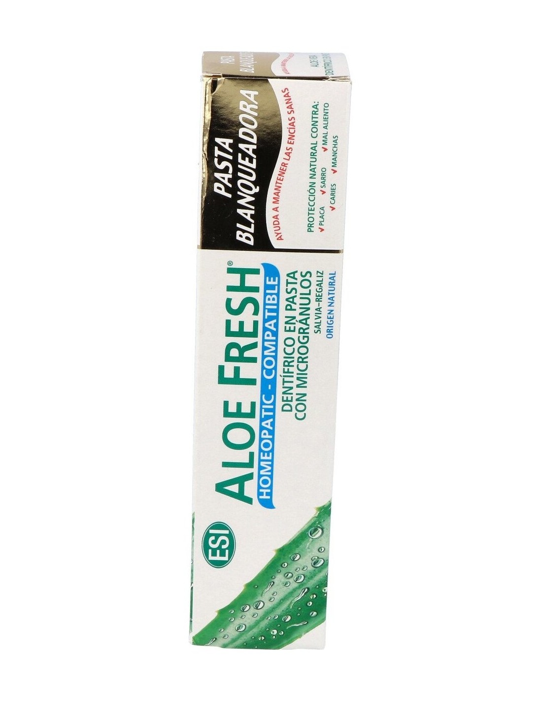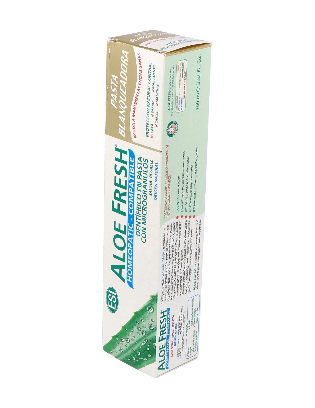 La pasta blanqueadora de la línea Aloe Fresh de ESI contiene activos 100% naturales que ayudan a aclarar la sonrisa, para que luzcas unos dientes con esmalte blanco. Además, su acción limpiadora eliminará de raíz las bacterias que se incrustan entre los dientes, previniendo la formación de caries, sarro y gingivitis.
