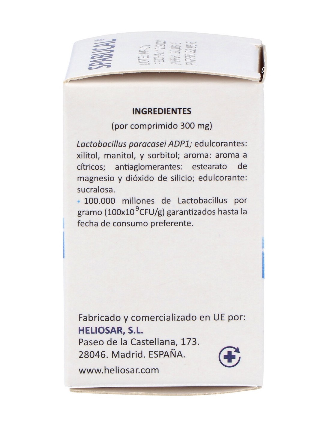 Lactobacillus paracasei ADP1 1x10e9 ufc/g, Manitol (E421), Xylitol (E967), Sorbitol (E420), Sucralosa (E421), Estearato de Magnesio (E470b), Dióxido de silicio (E551) y Aroma.