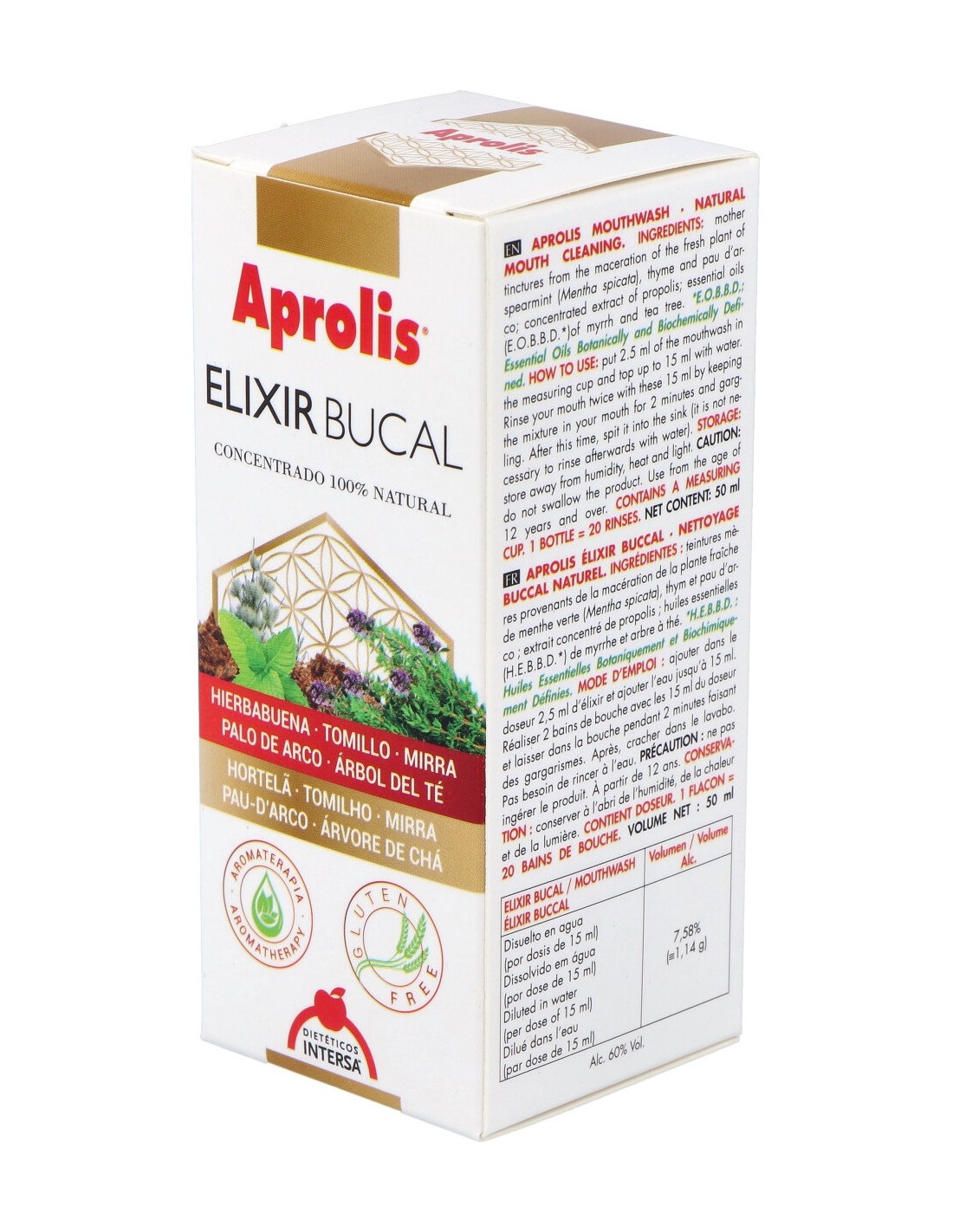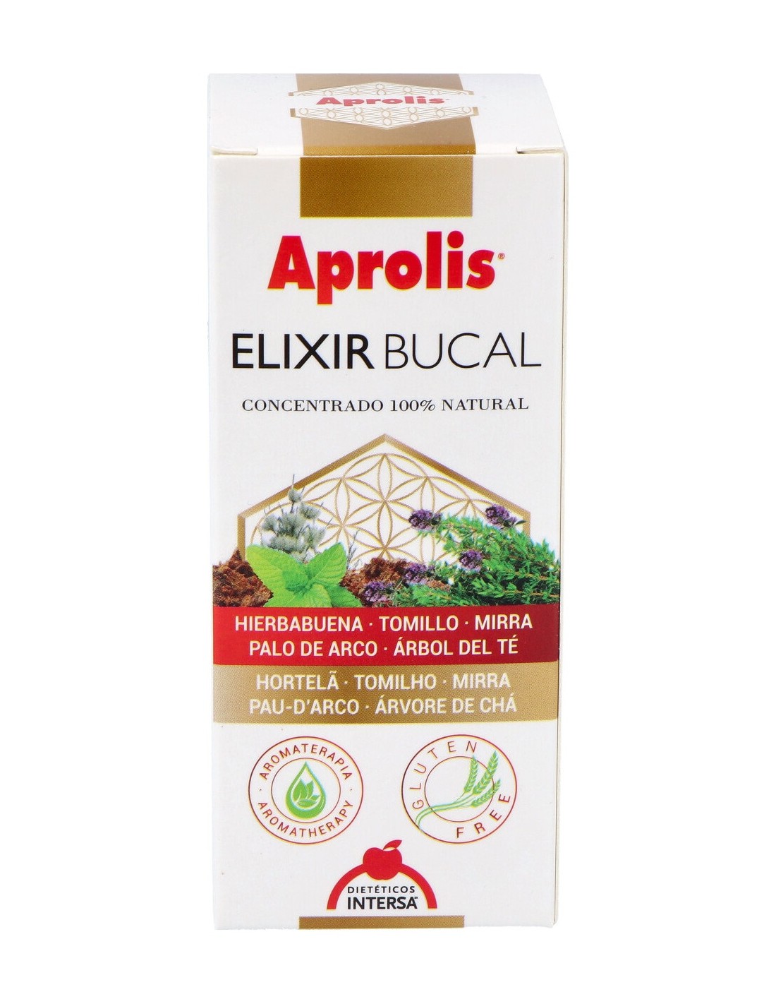 Hierbabuena (Mentha viridis L.), Tomillo (Thymus vulgaris L.), Pao d´arco (Tabebuia impetiginosa L.). Extracto de Propóleo. Aceites esenciales de: Mirra (Commiphora myrrha L.), Árbol de té (Melaleuca alternifolia L.), Otros ingredientes:Mentha Viridis (Spearmint) Extract, Thymus Vulgaris (Thyme) Extract, Lavandula Angustifolia (Lavender) Extract, Tabebuia Impetiginosa Extract, Propolis Extract, Commiphora Myrrha Oil, Melateuca Alternifolia (Tea Tree) Oil.