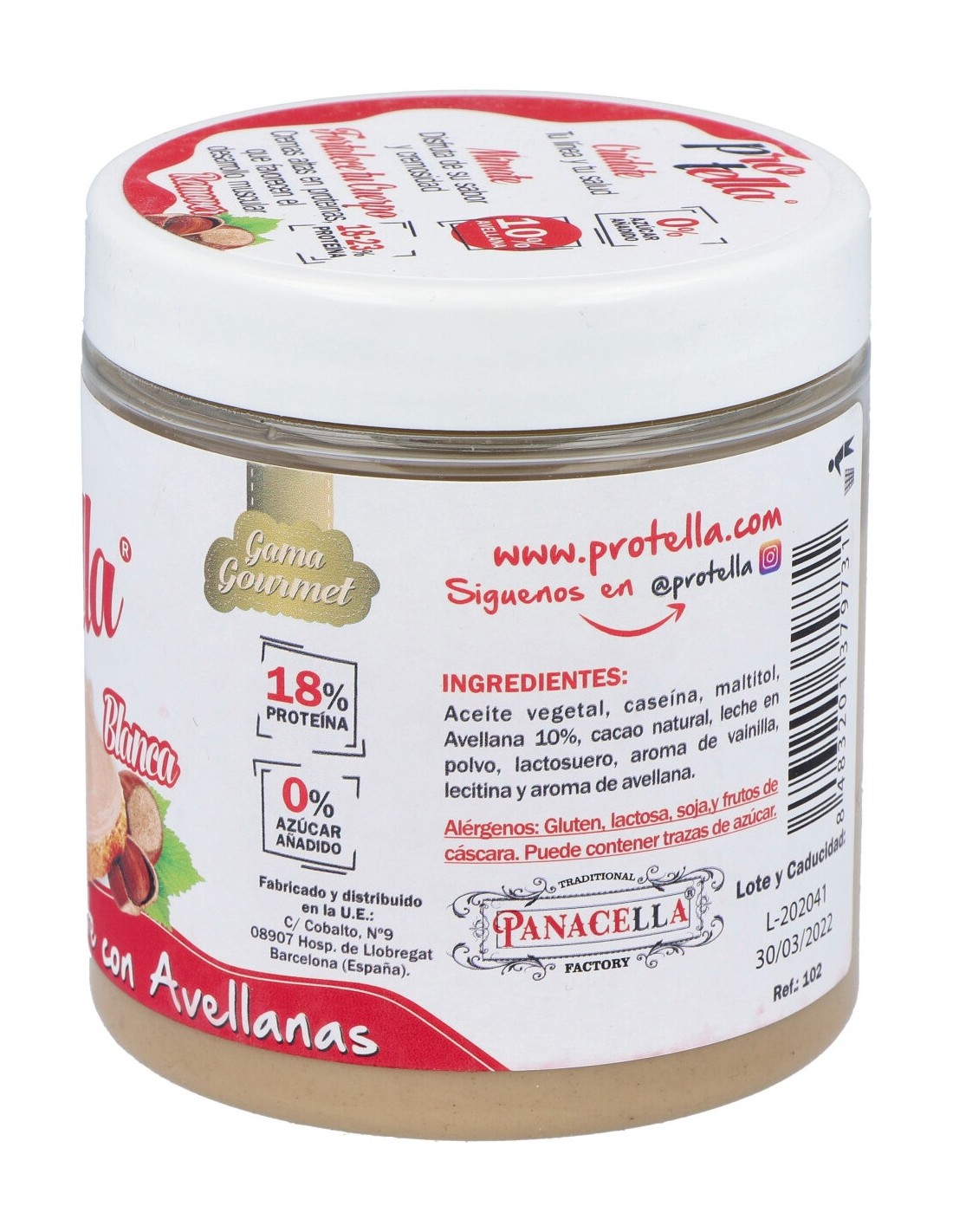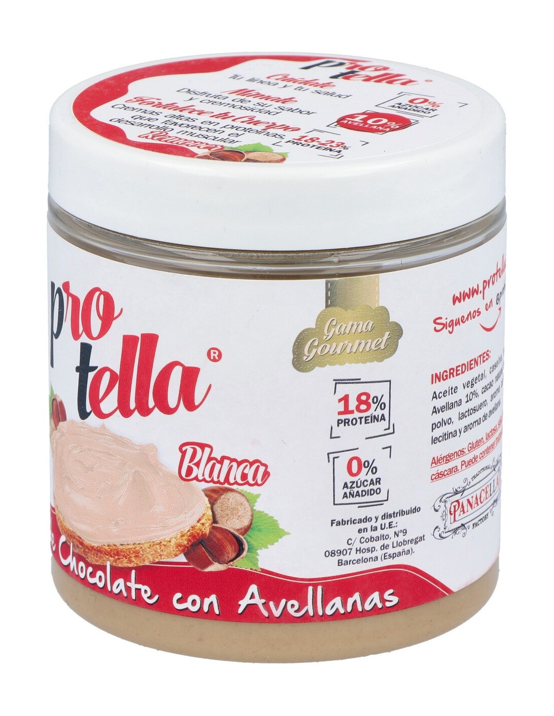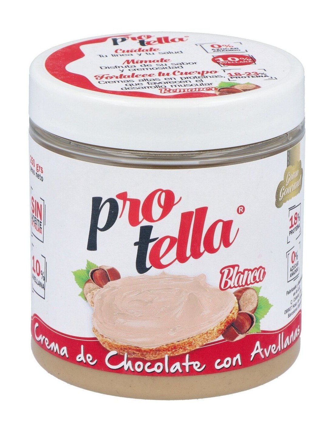 Crema de chocolate blanco con avellanas y proteína. Es un producto apto para diabéticos pero contiene un poco de azúcar debido al chocolate blanco. Sabor y olor a chocolate con avellanas.