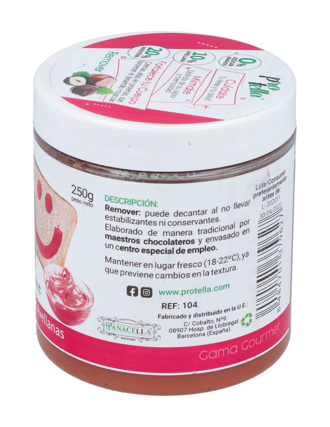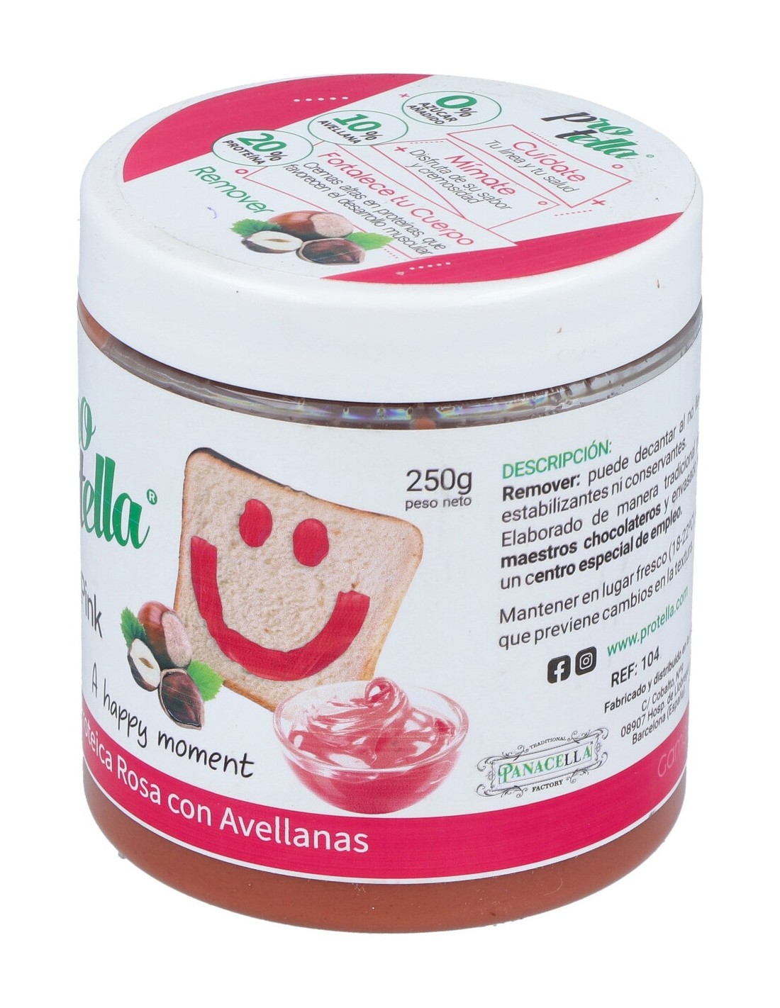 Aceite vegetal, Arla Protein Lacprodan®, maltitol, leche en polvo, pasta de avellana al 10%, manteca de coco y karité, inulina, lecitina y aromas rosas.