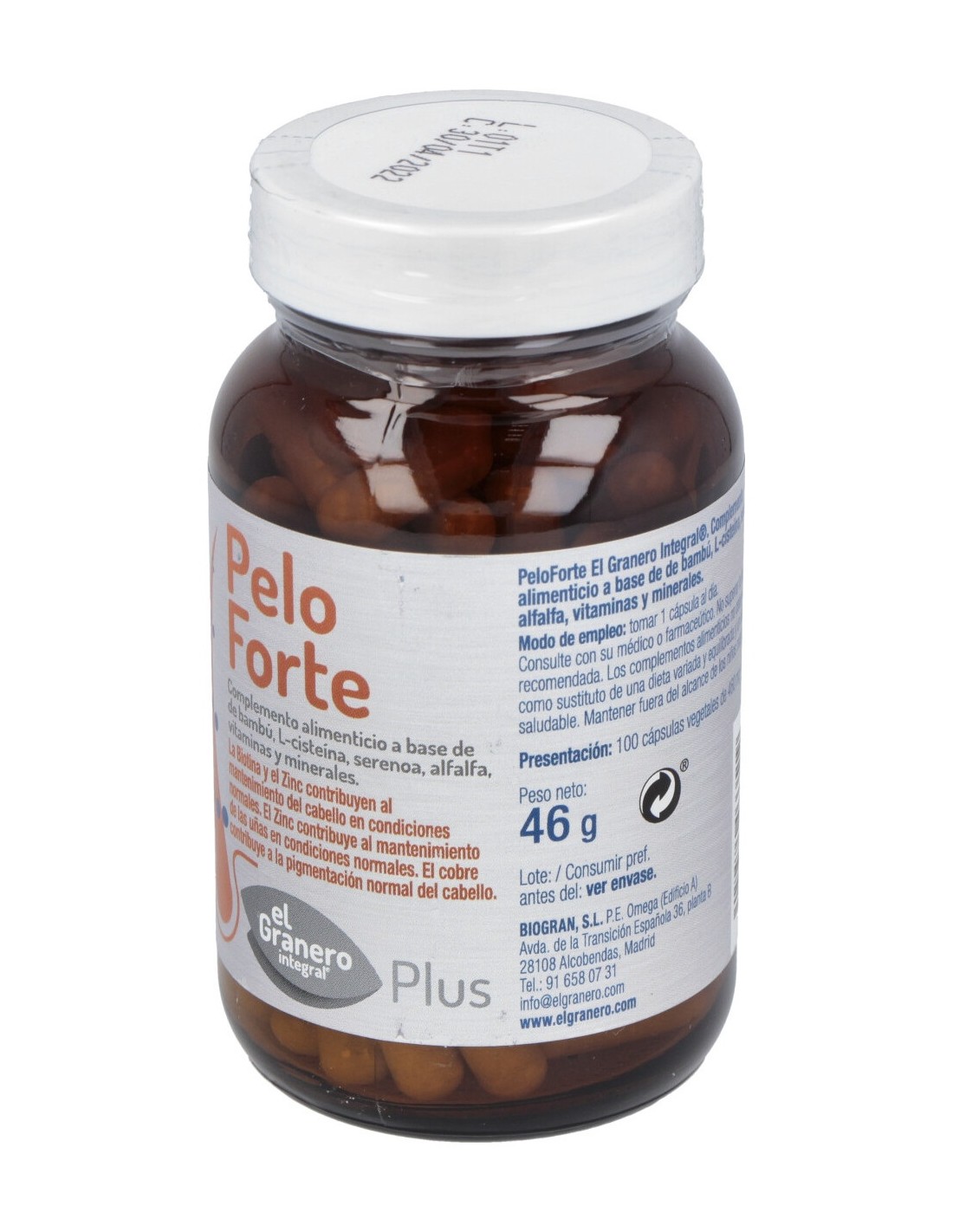 150 mg de extracto seco de brotes de bambú (105 mg de ácido silícico y equivalente a 1500 mg de brote de bambú en polvo), 50 mg de extracto seco de frutos de serenoa repens (22,5 mg de ácidos grasos y equivalente a 250 mg de frutos en polvo), 50 mg de extracto seco de partes aéreas de alfalfa (2,5 mg de isoflavonas), 50 mg de l-cisteína, 4,5 mg de vitamina B5, 1,2 mg de vitamina B6 (piridoxina clorhidrato), 200 mcg de ácido fólico, 75 mcg de d-biotina, 2,5 mcg de vitamina B12, 105 mg de ácido silícico (origen bambú), 10 mg de zinc, 1 mg de cobre.