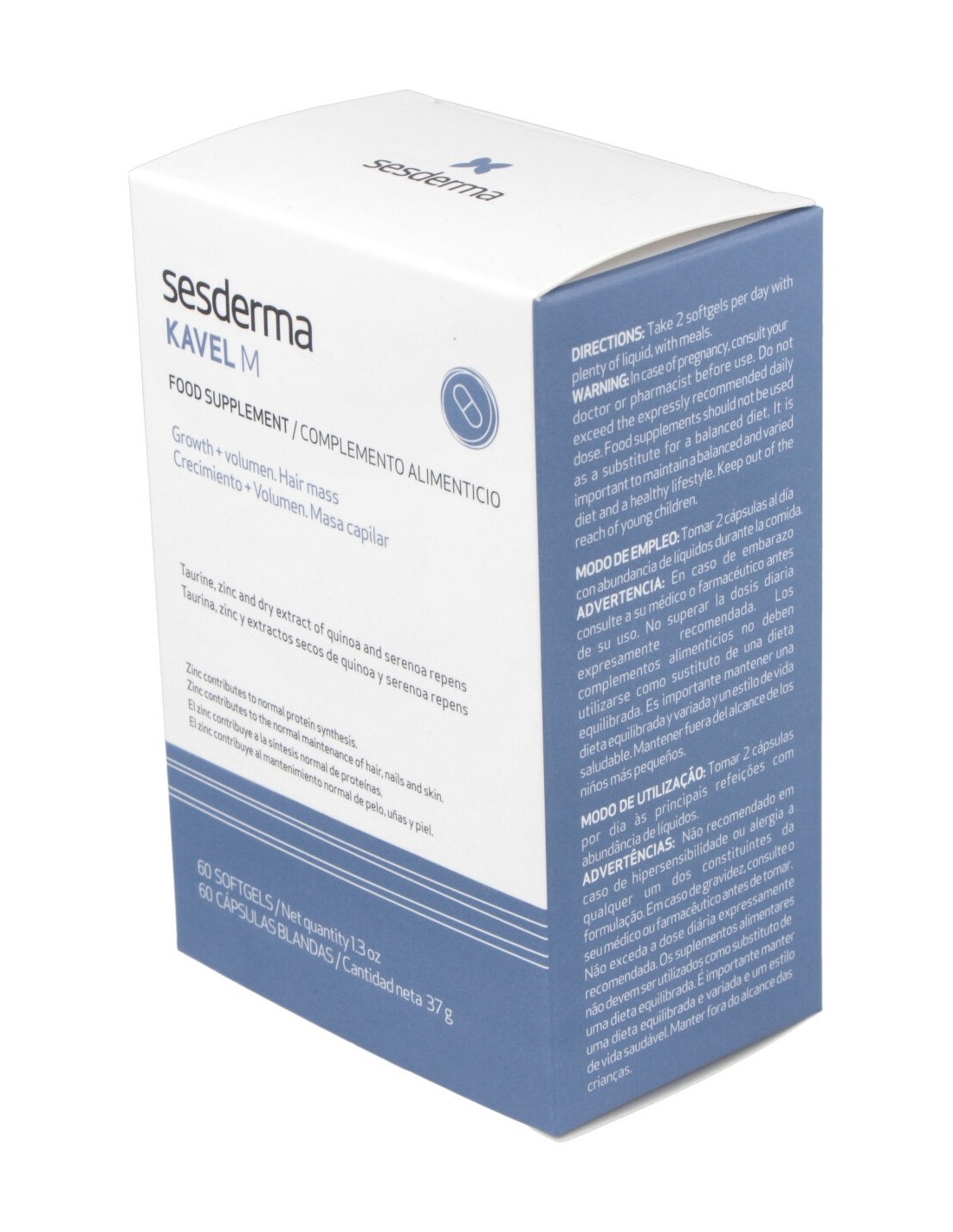 Sesderma Kavel M es un complemento alimenticio recomendado para la caída del cabello tanto recurente como ocasional. En su fórmula destacan el ácido glicólico, que mejora la estructura interna del cabello estimulando la síntesis del colágeno; proteínas lácteas que aumentan la firmeza y suavidad y, ácidos boswélicos que proporcionan un efecto calmante.