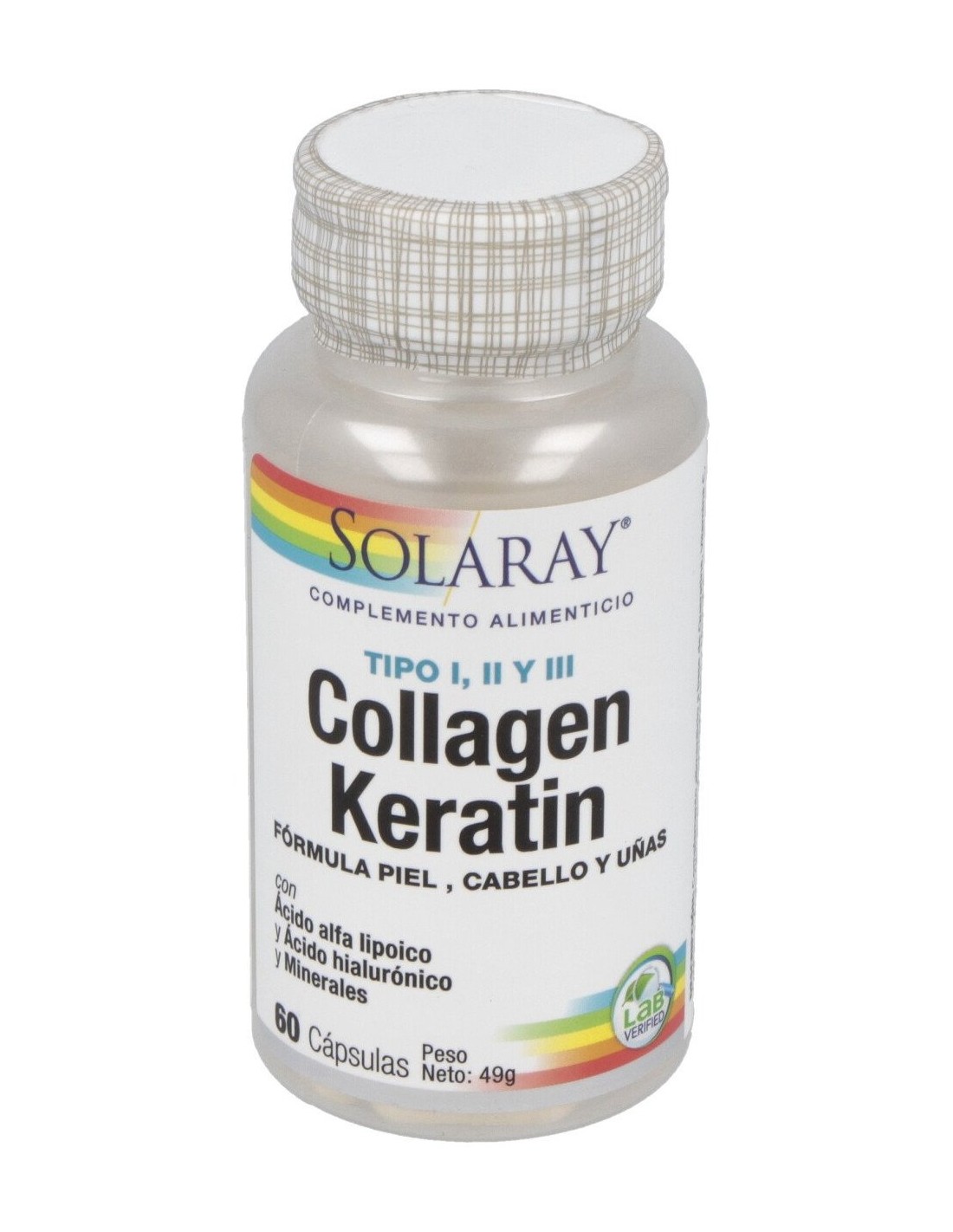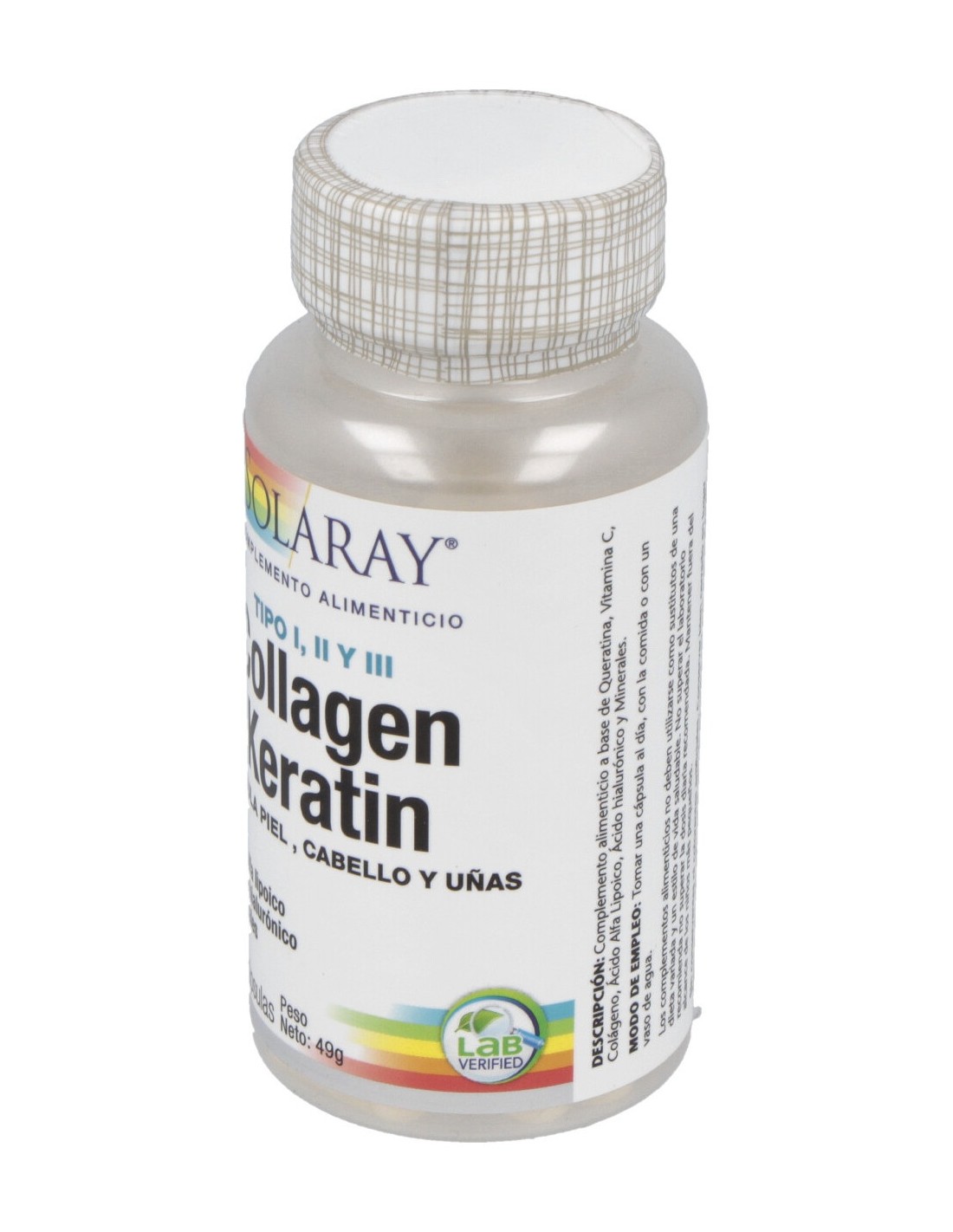 Solaray Collagen Keratin es un complemento alimenticio a base de colágeno que ayuda a reforzar la piel y articulaciones gracias al ácido hialurónico, la queratina, la vitamina C, el zinc y antioxidantes.