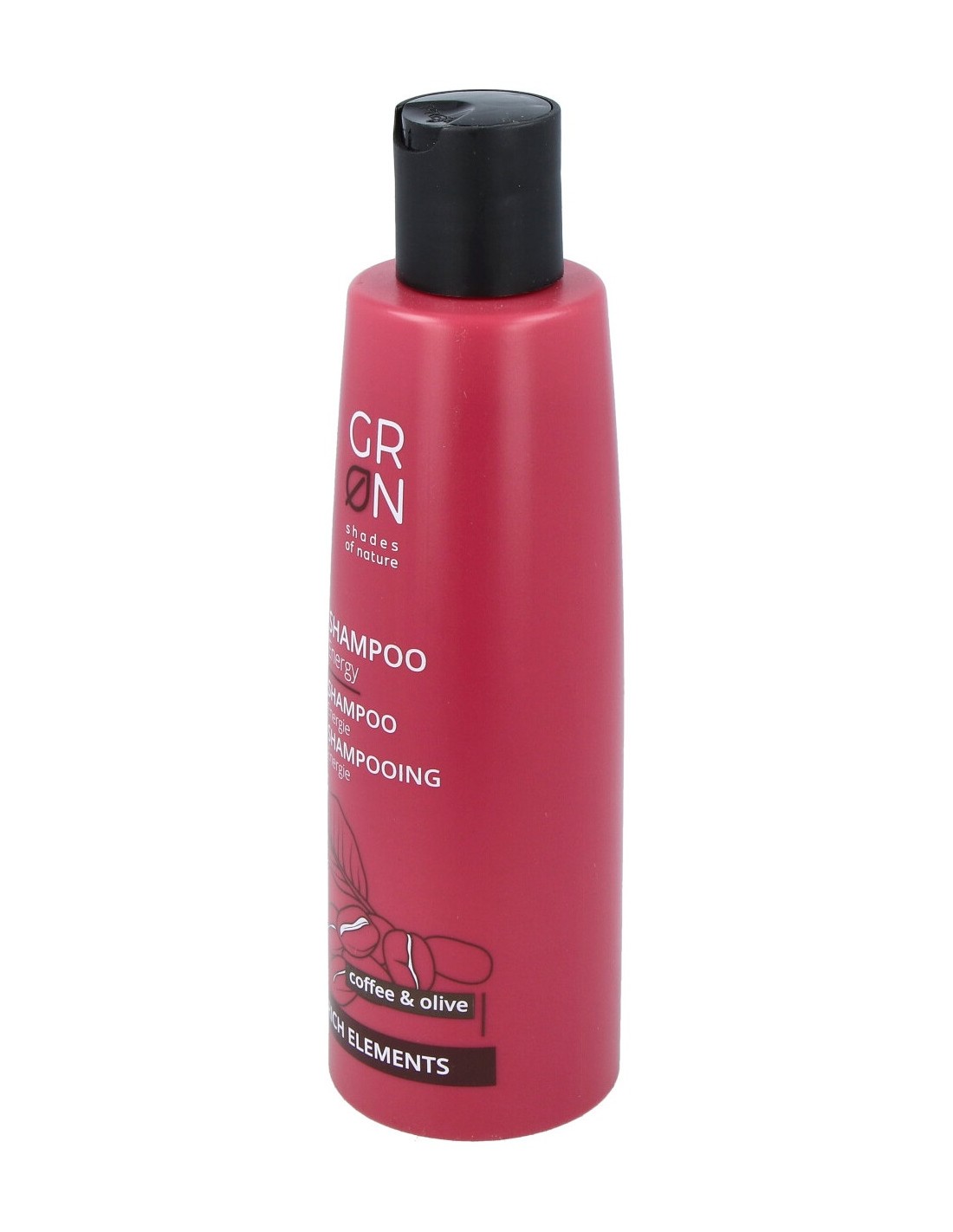 Champú energizante indicado para cabello apagado y sin vida, contiene aceite de grano de café y aceite de oliva que hidratan el cabello y los extractos de caléndula, granada y romero nutren el cabello y el cuero cabelludo. Fórmula vegana. Producto certificado Cosmos Organic.