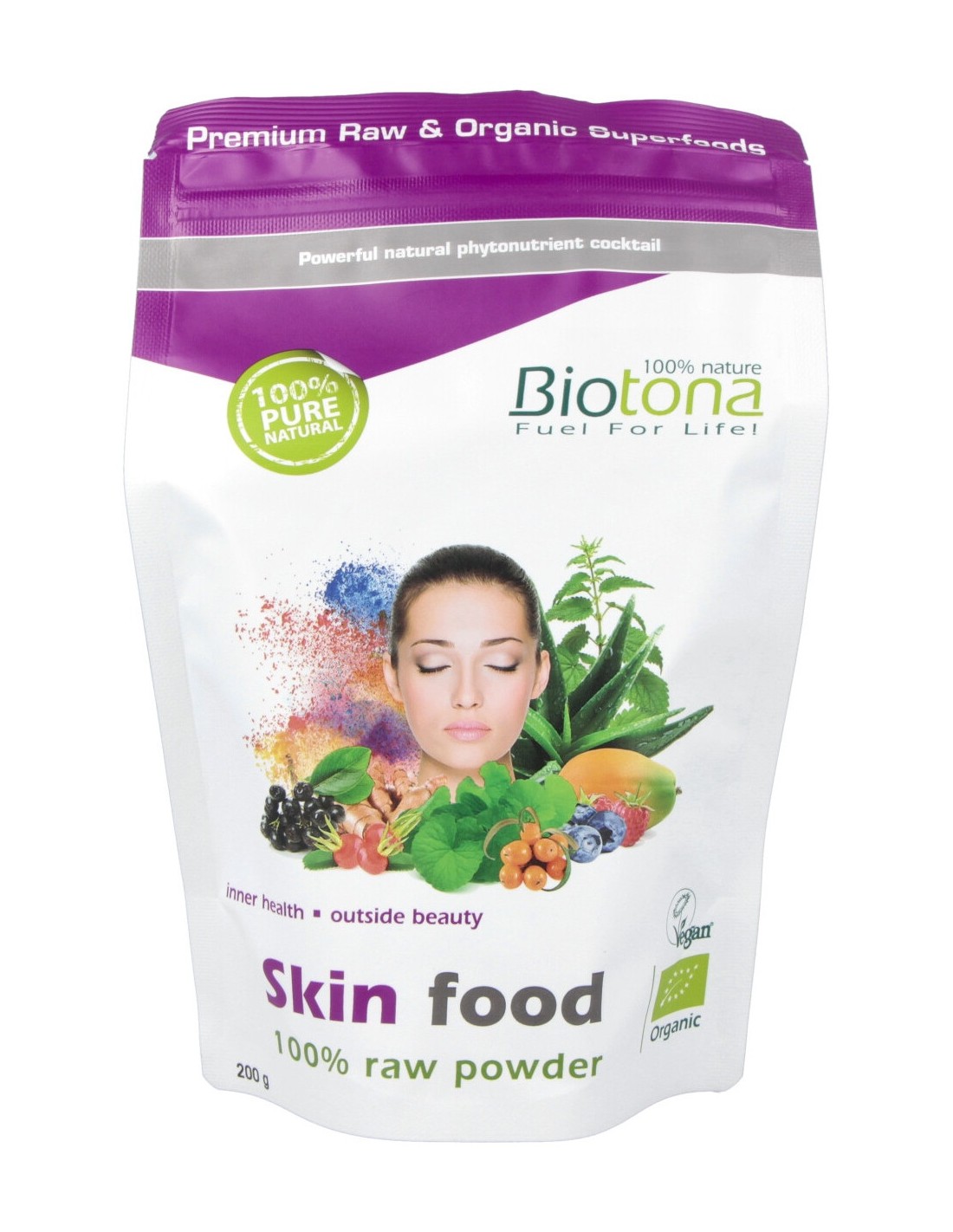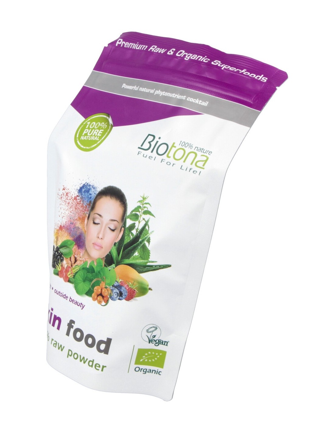 · Biotona Skin food contiene polvo raw de gel de aloe vera, ortiga, espino amarillo y cúrcuma para la salud de la piel.