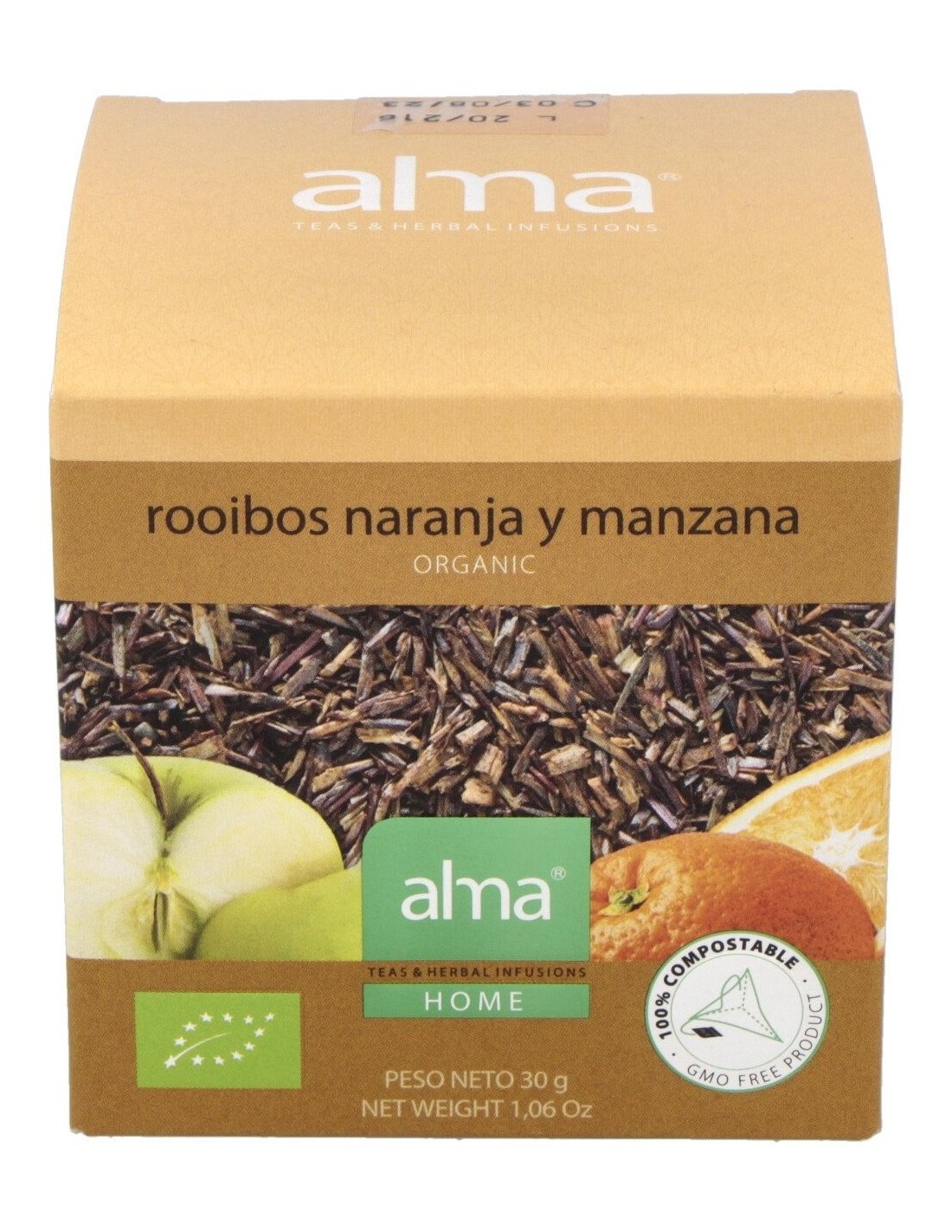 Alma Home Infusión Rooibos Naranja Manzana 15 Bolsas infusión 100% ecológica de Rooibos con Naranja y Manzana. Su sabor con notas dulces y un final especiado, magnifico aliado para el invierno por sus propiedades antioxidantes e inmunoprotectoras.