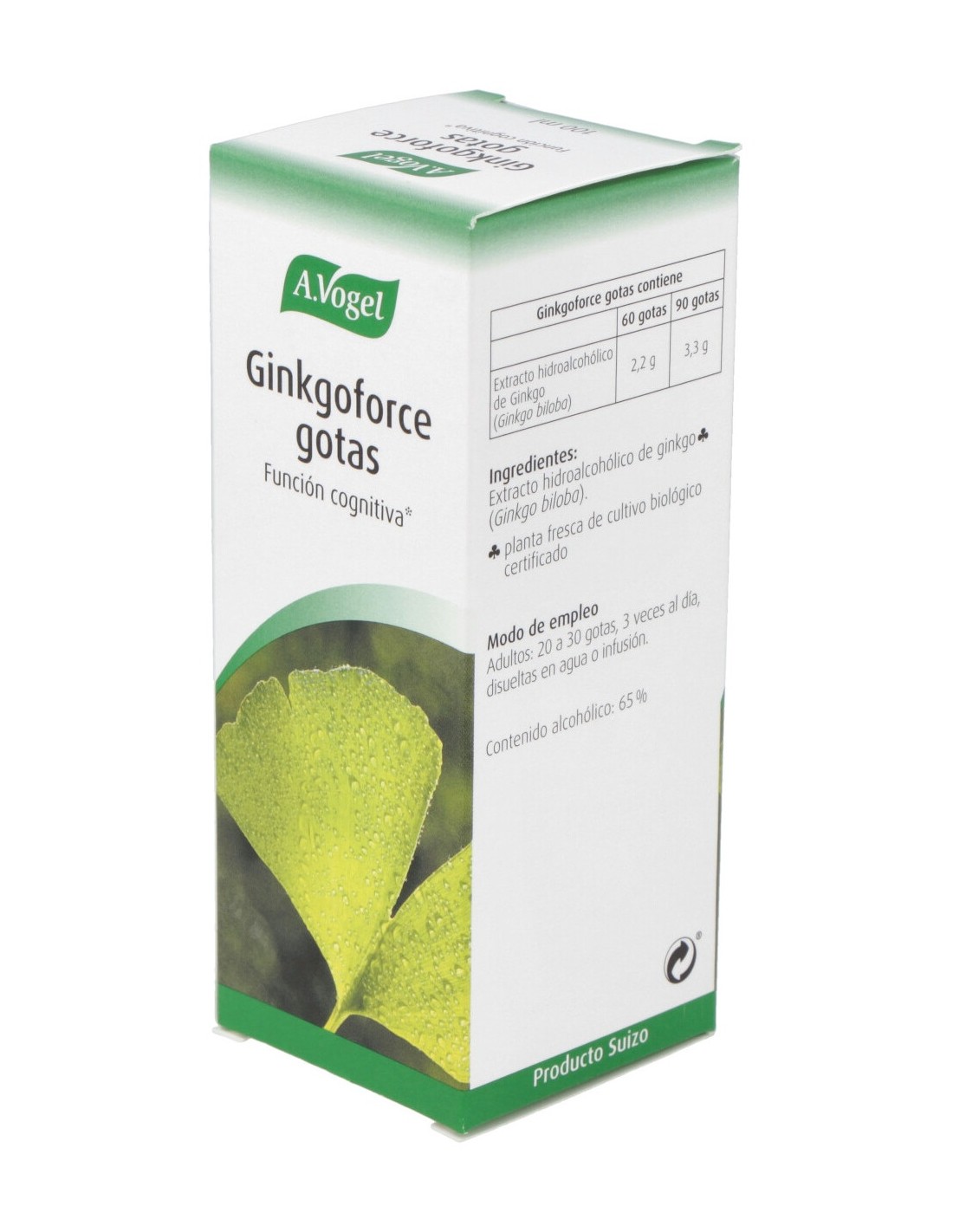 A.Vogel Ginkgoforce gotas es un complemento nutricional indicado para remediar problemas asociados a la arteriosclerosis, como la pérdida de memoria, falta de atención o falta de irrigación cerebral.