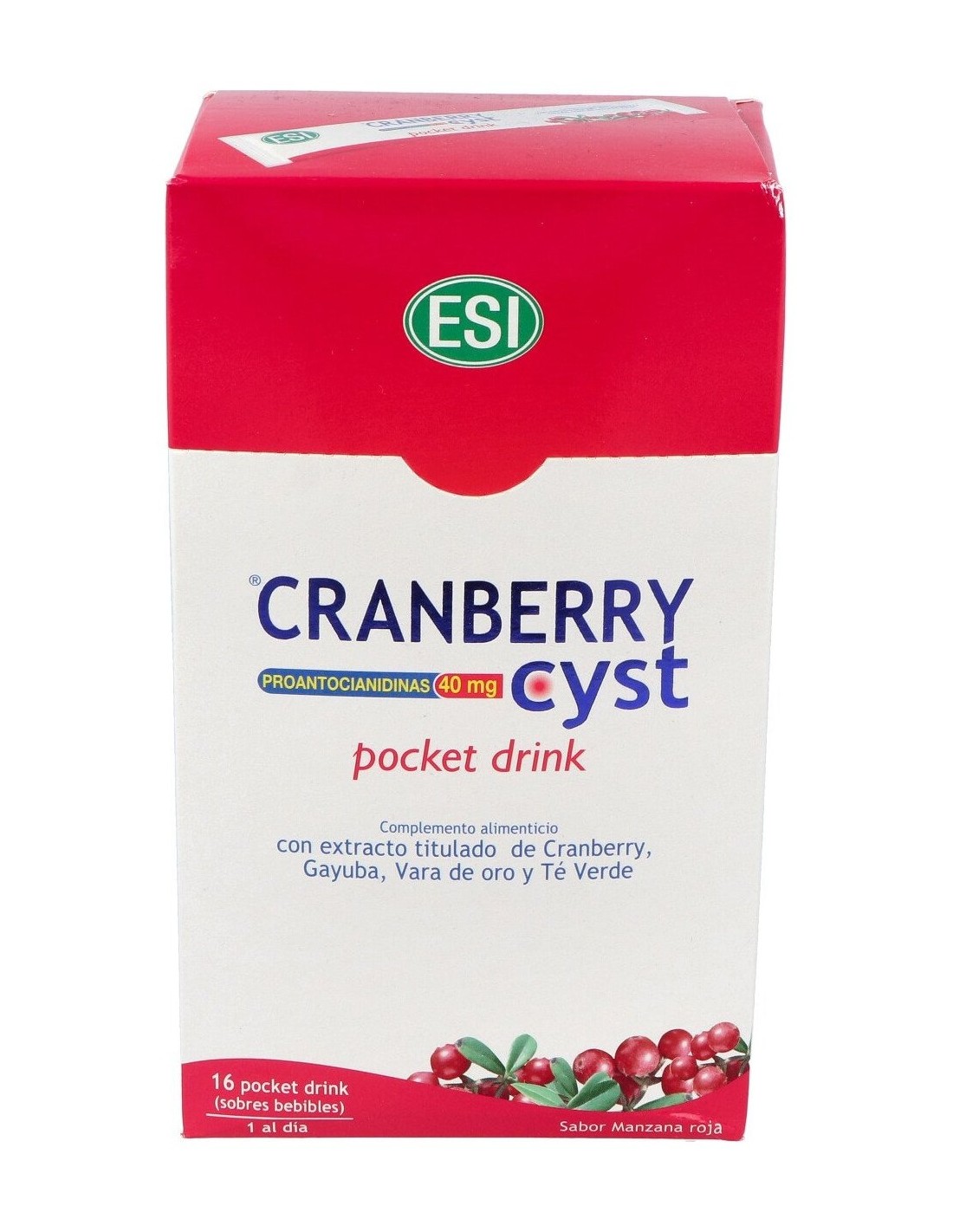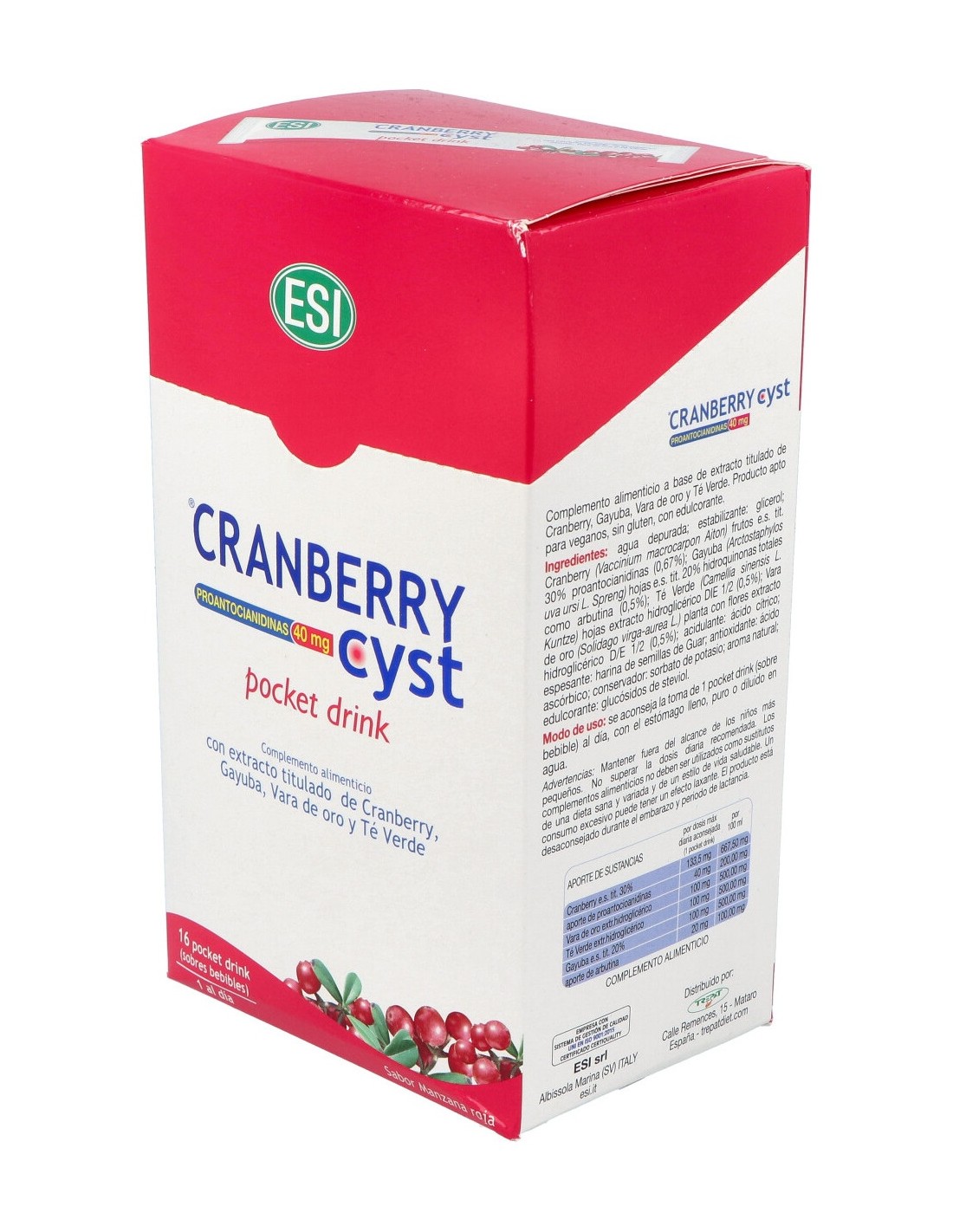 Los laboratorios ESI presentan Cranberry Cyst, unos sobres bebibles cuya solución líquida ha sido realizada a base de gayuba, té verde, arándano rojo y vara de oro. La combinación de estos ingredientes naturales proporciona un producto ideal para las vías urinarias.