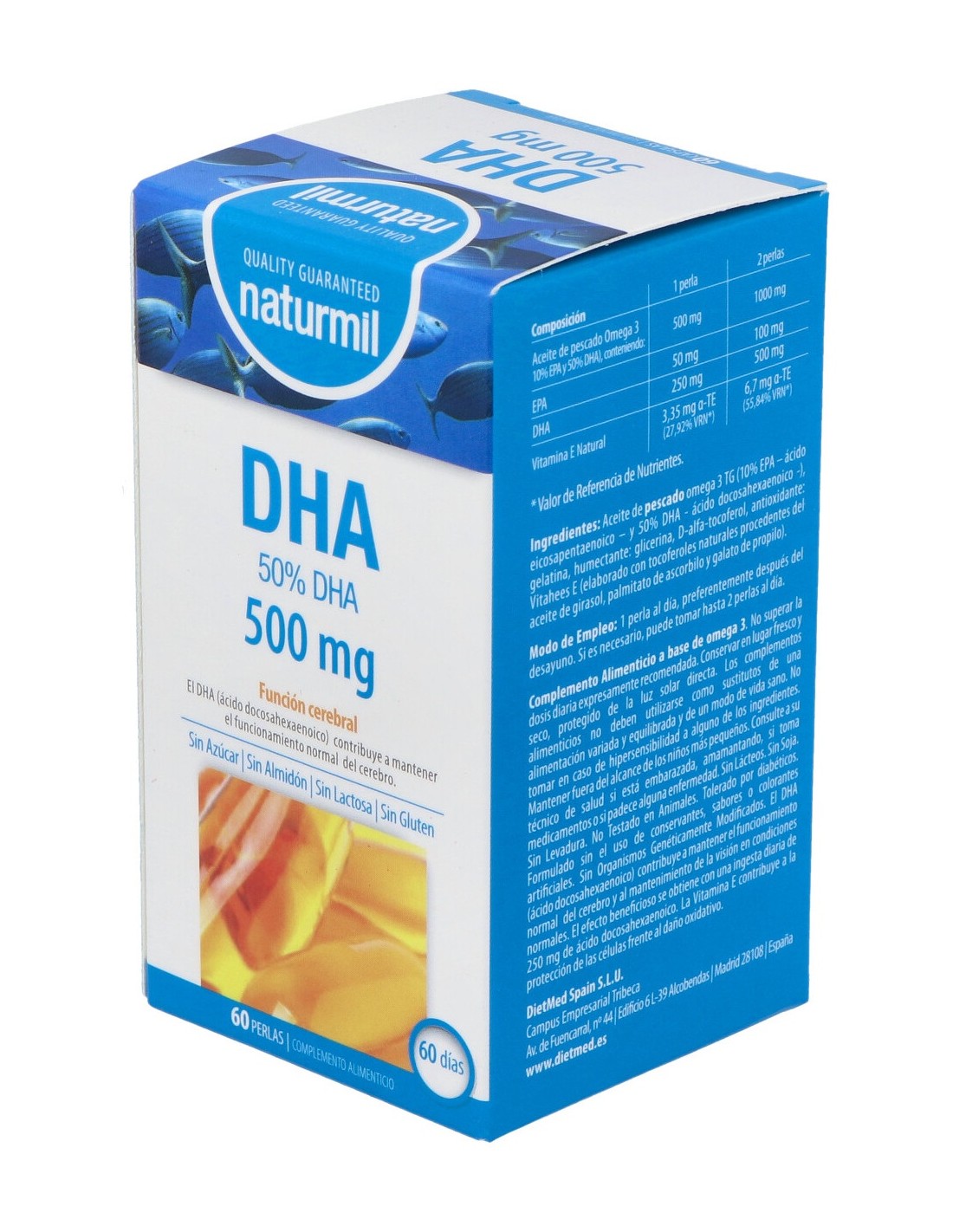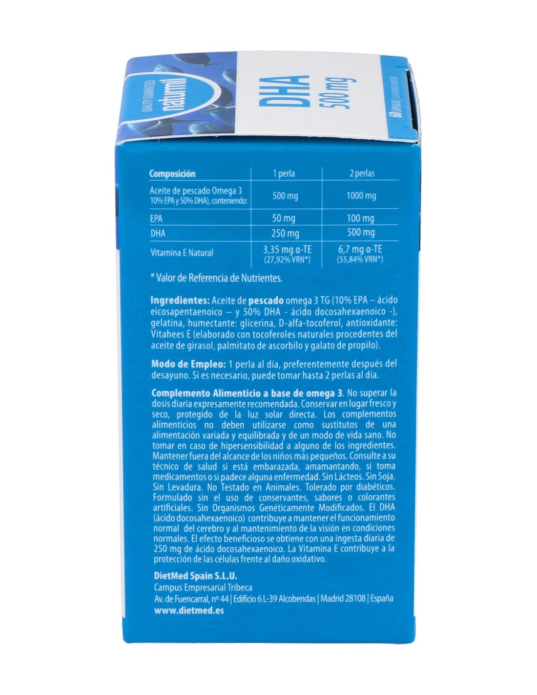 Aceite de pescado Omega 3 500 mg (10% EPA y 50% DHA), conteniendo: EPA 50 mg, DHA 250 mg, Vitamina E Natural 3,35 mg a-TE (27,92% VRN*).
