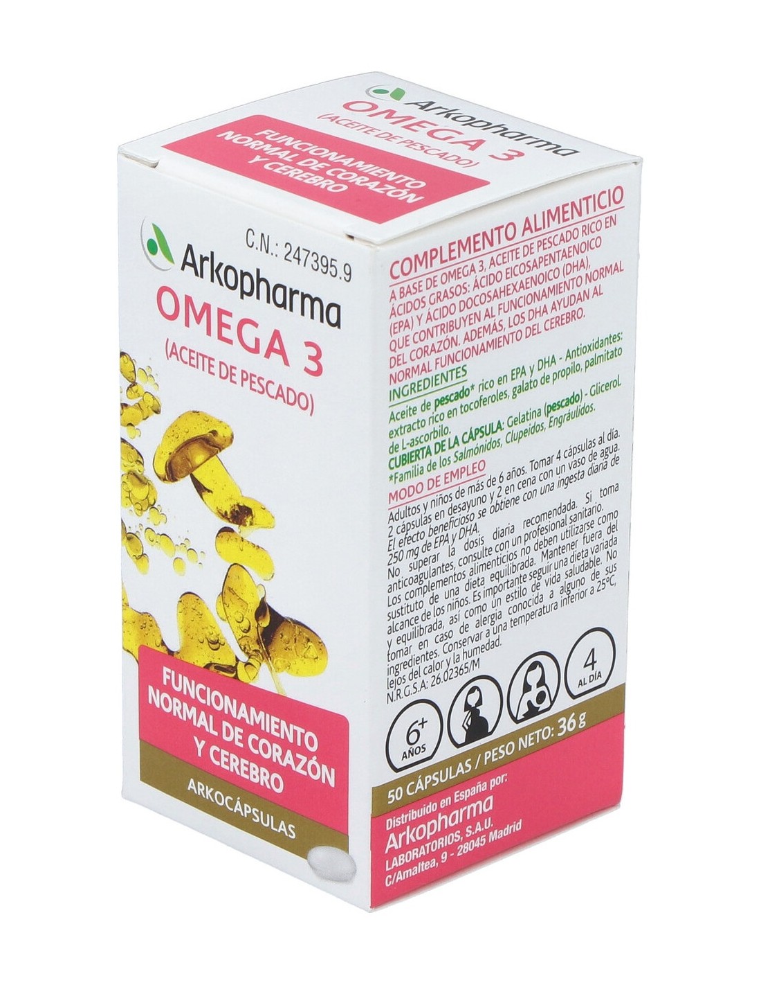 Perlas conteniendo 520mg de aceite de salmón con una valoración del 18% en ácido eicosapentanóico (EPA) y 12% de docosahexanoico (DHA). Espesante: dióxido de silicio; antioxidantes: alfa tocoferol, ácido palmitil 6 L ascórbico (soja). Perla: gelatina; humectante: glicerol; agua.