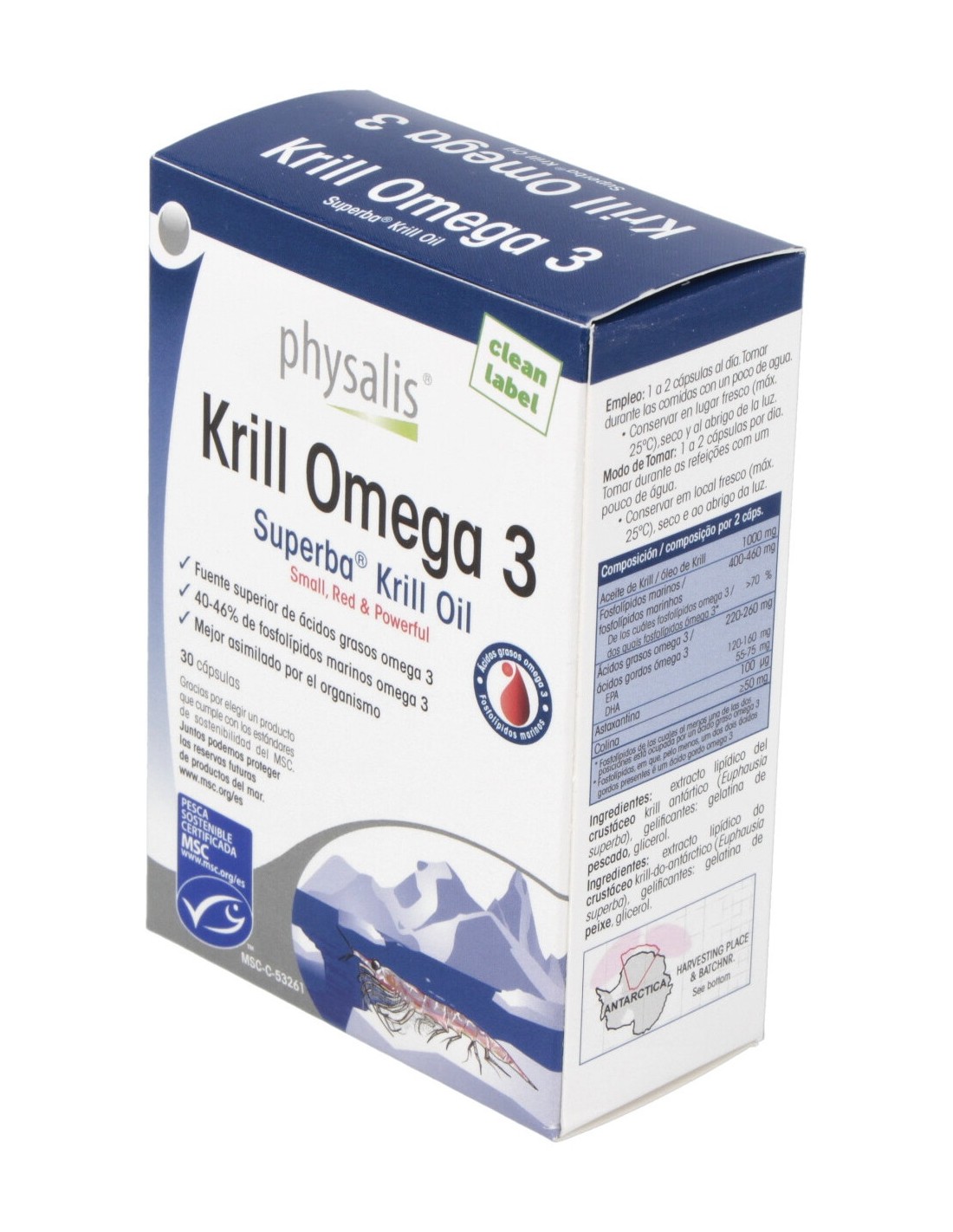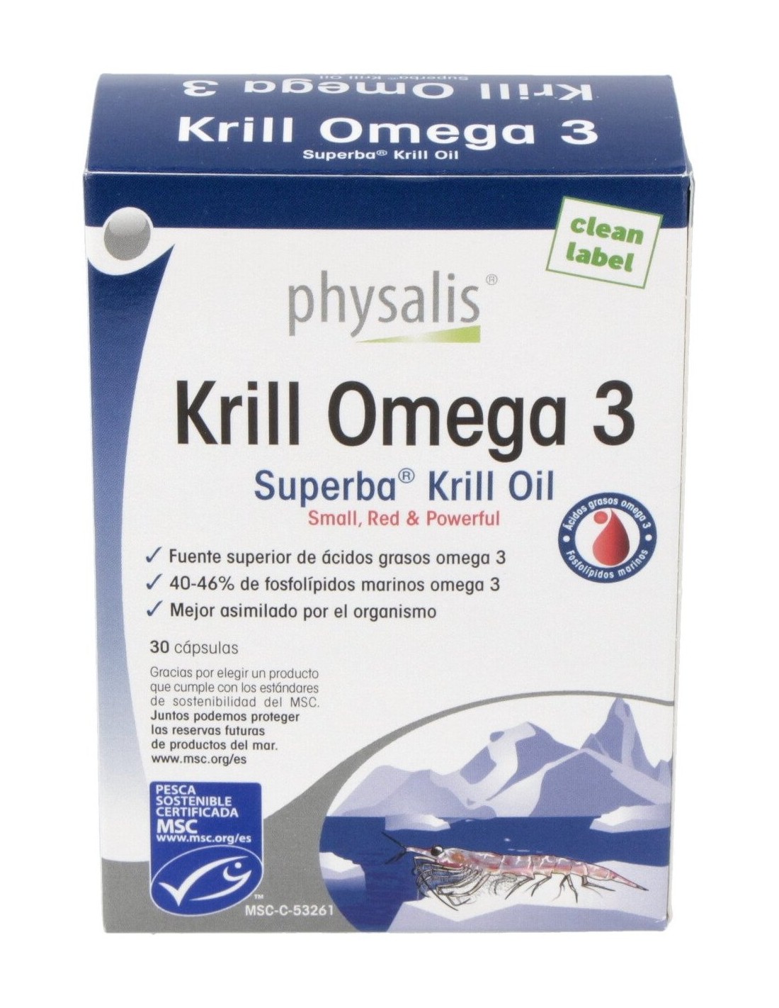 Complemento alimenticio a base de krill. Estas pequeñas gambas de aguas frías es una especie de zooplancton marino que ayuda a mejorar los lípidos en la sangre, contribuyendo a mejorar la salud del corazón y del sistema nervioso. Su alto contenido en Omega-3 ayuda a mejorar la concentración y la memoria.