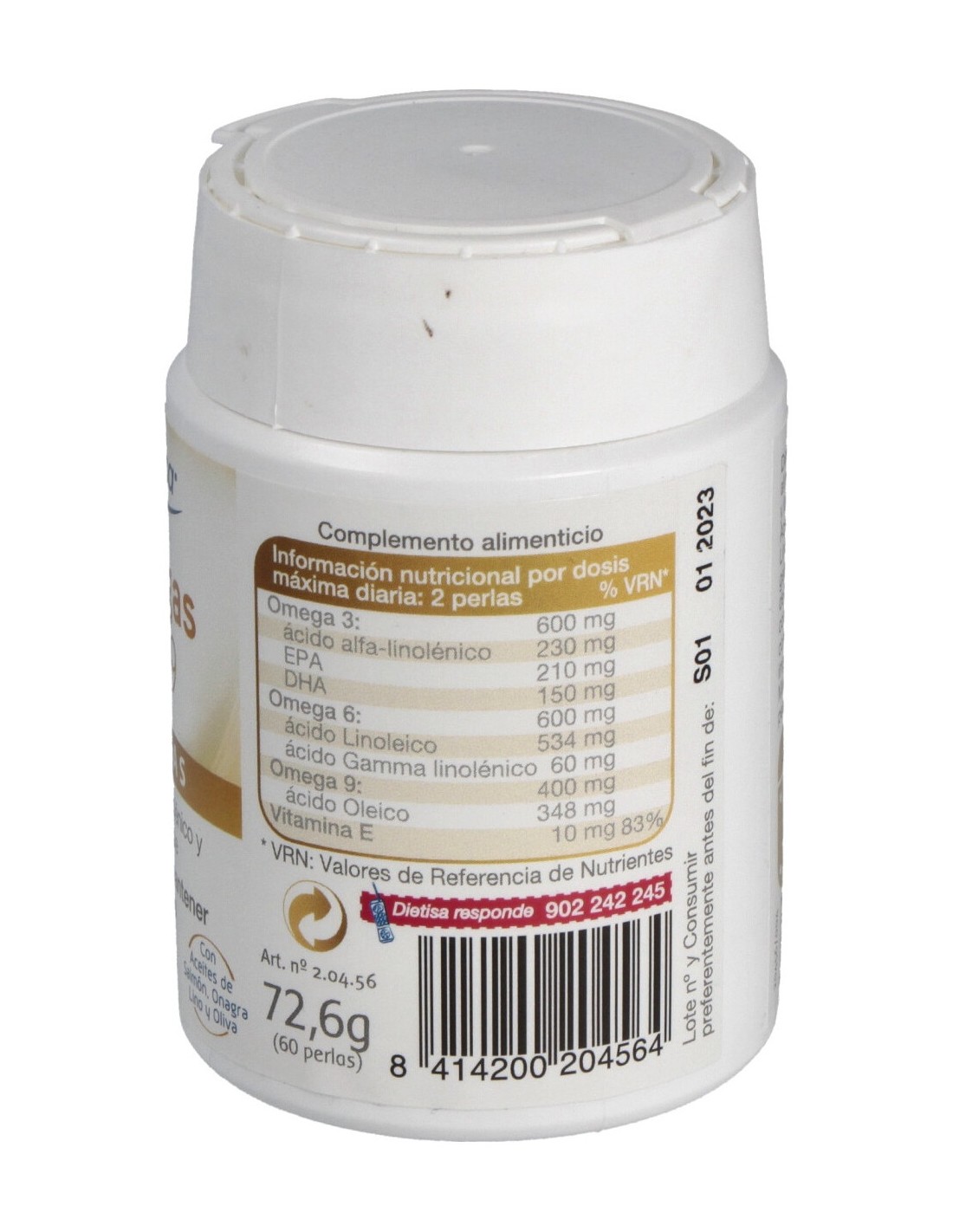 ACEITE DE SALMÓN, ACEITE DE ONAGRA, ACEITE DE OLIVA, ACEITE DE LINO Y VITAMINA E. PERLA: GELATINA Y GLICERINA.
