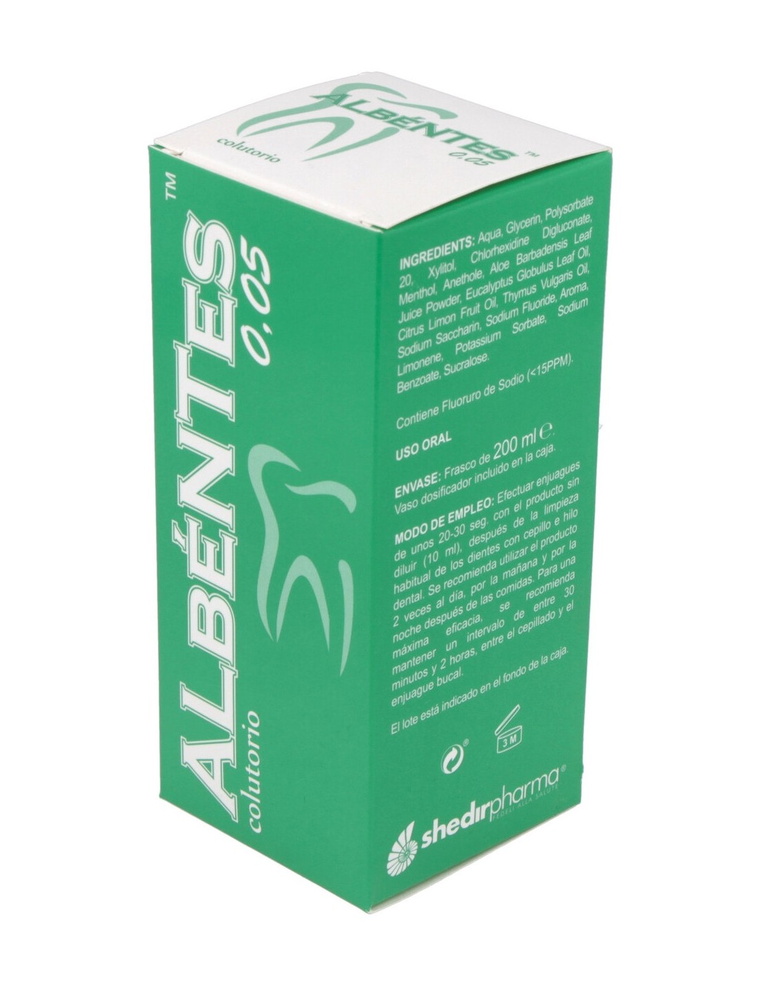 Enriquecido con aceites esenciales, Mentol y Anetol promueve la higienización de la cavidad oral. Puede ser útil para la prevención de la placa bacteriana y es de ayuda en caso de mal aliento.COLUTORIO ALBENTES 0,05 200ml. de SHEDIR