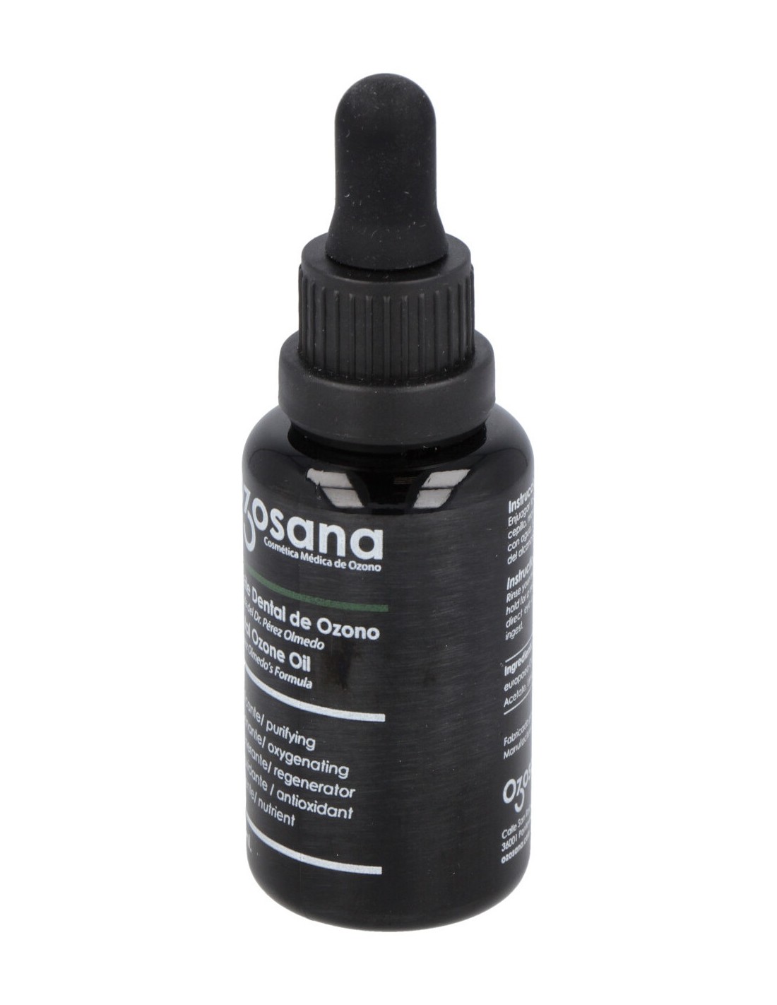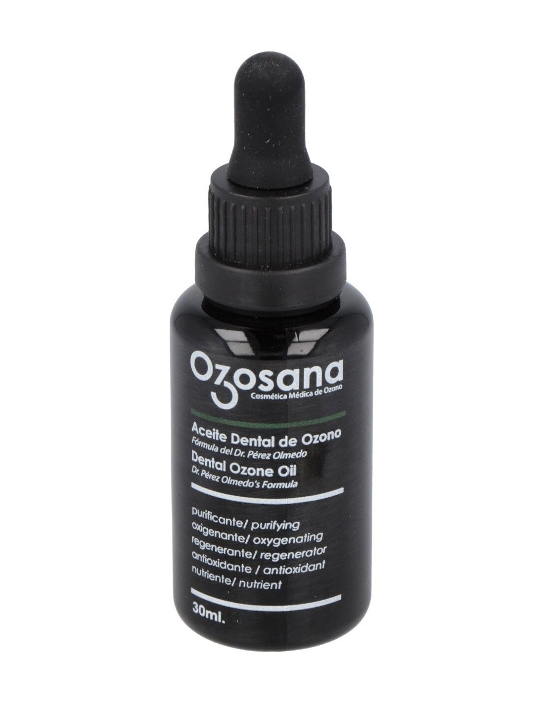 Aceite ozonizado para uso bucal, que actúa como un eficaz antiséptico, ayudando a evitar la proliferación de bacterias patógenas. Su textura untuosa se fija y nutre las encías, e impide la fijación de placa.