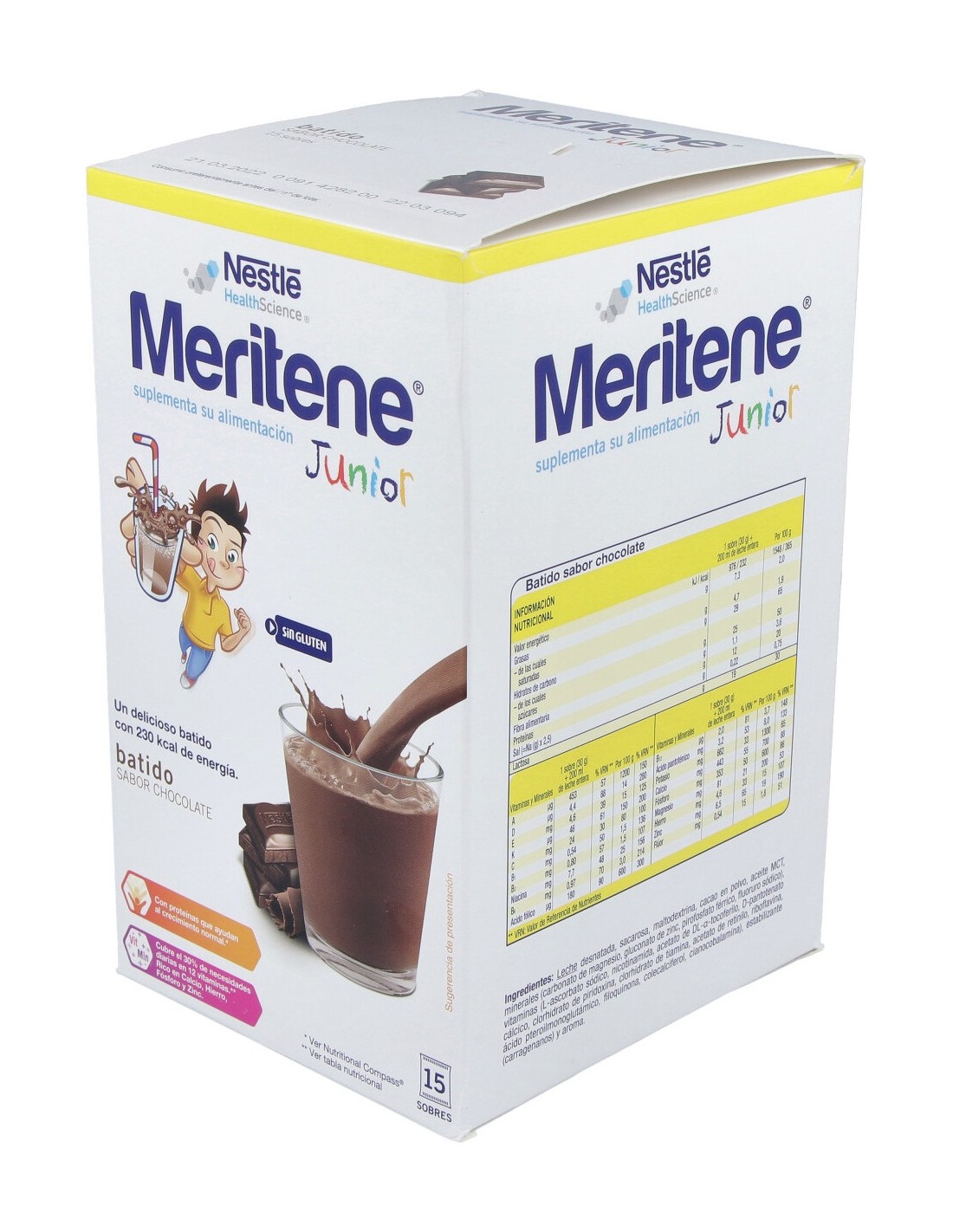 Sabor Chocolate: Leche desnatada, sacarosa, maltodextrina, cacao en polvo, aceite MCT, minerales (carbonato magnésico, gluconato de zinc, pirofosfato férrico, fluoruro sódico), vitaminas (L-ascorbato sódico, nicotinamida, acetato de DL-alfa-tocoferilo, D-pantotenato cálcico, clorhidrato de piridoxina, clorhidrato de tiamina, acetato de retinilo, riboflavina, ácido pteroilmonoglutámico, filoquinona, colecalciferol, cianocobalamina), estabilizante (carragenano) y aroma.