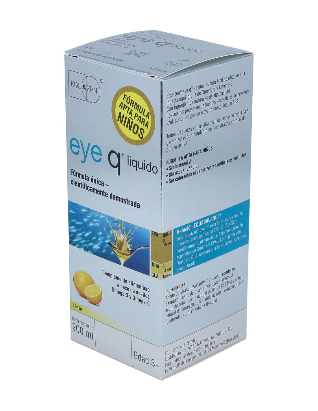 Vitae Eye q liquid 200ml es un complemento alimenticio en formato líquido a base de aceites Omega-3 y Omega-6. De origen marino y vegetal, este suplemento ayuda a favorecer el funcionamiento neurológico normal. También disponible en cápsulas.
