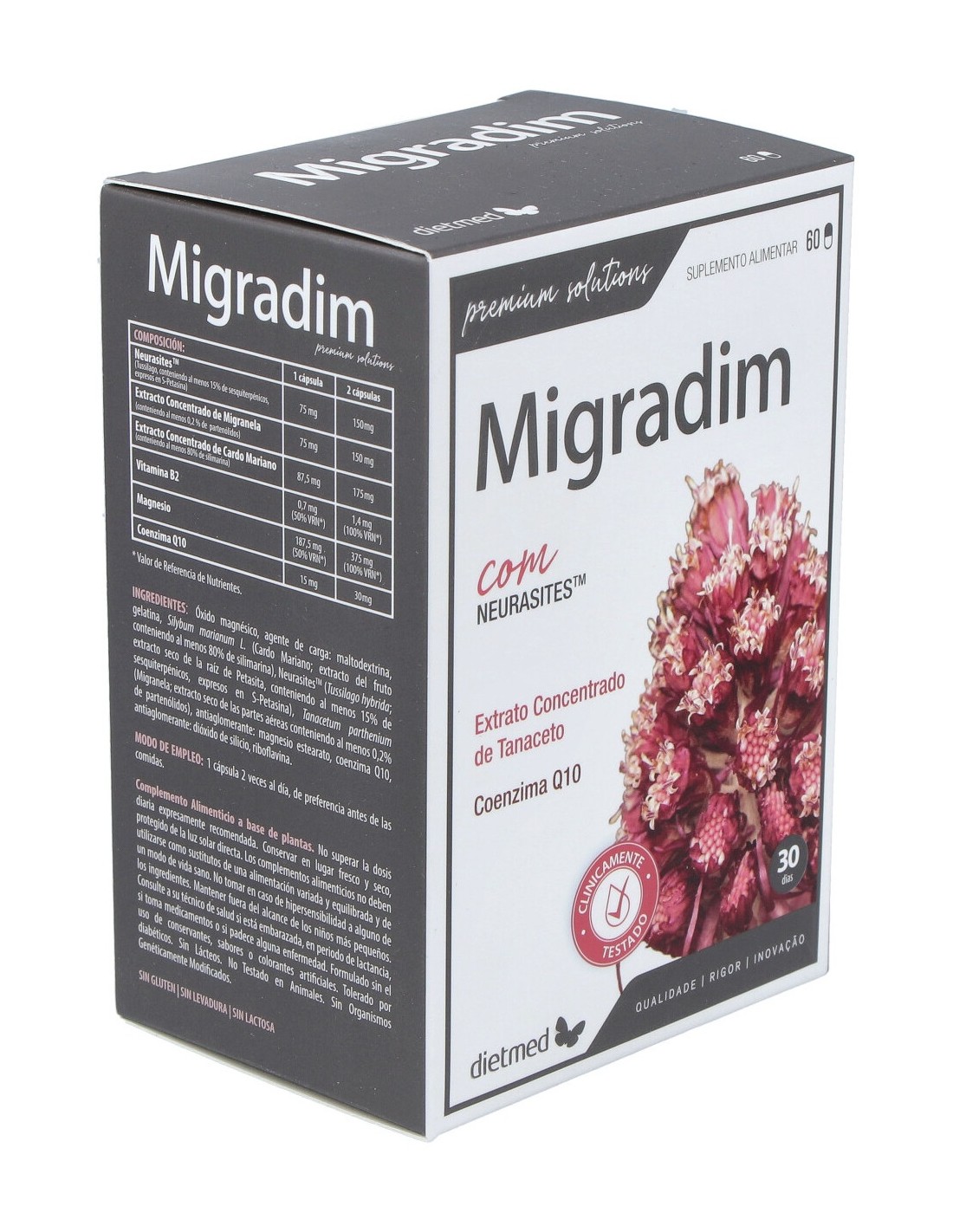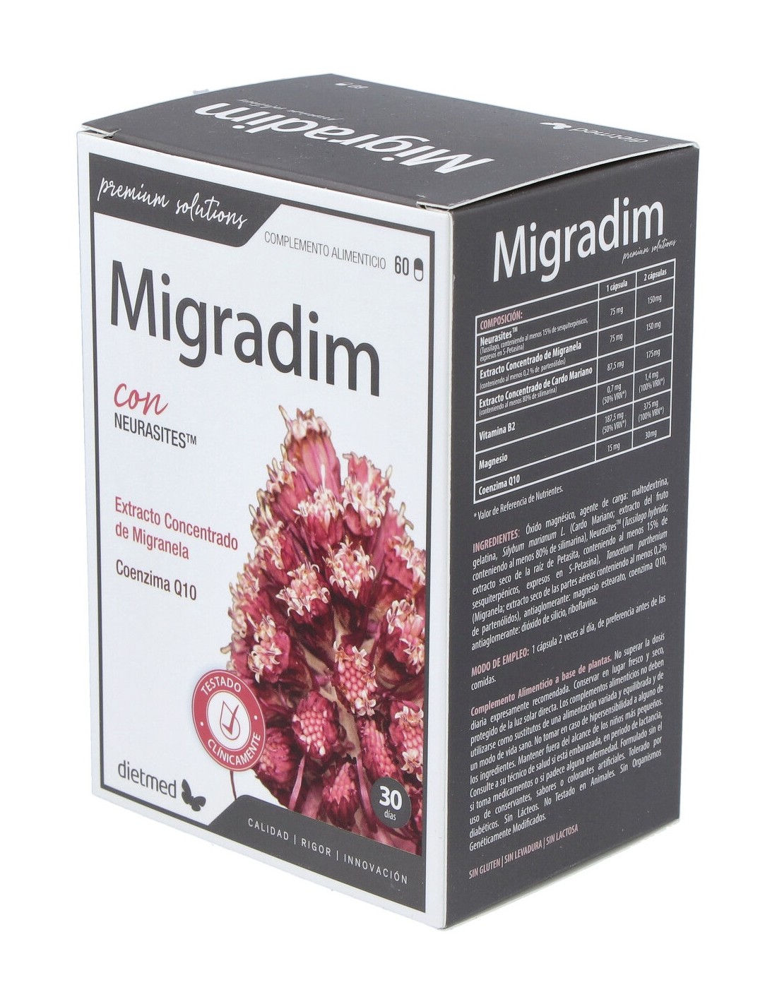 NeurasitesTM (Tusílago, conteniendo al menos 15% de sesquiterpenos, expresados en S-Petasina) 150 mg, Extracto Concentrado de Migranela (conteniendo al menos 0,2% de partenólidos) 150 mg, Extracto Concentrado de Cardo Mariano (conteniendo al menos 80% de silimarina) 175 mg, Vitamina B2 1,4 mg (100% VRN*), Magnesio 375 mg (100% VRN*), Coenzima Q10 30 mg.