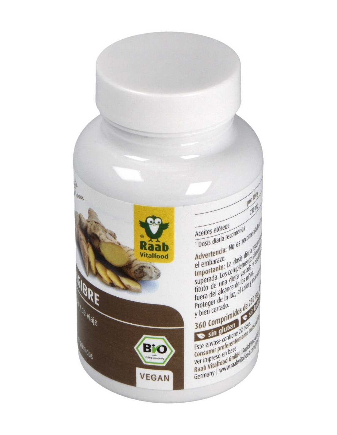 73% de polvo de jengibre*, salvado de cáscara de avena*, jarabe de maíz, agente separador: cera de carnauba, dióxido de silicio (*de cultivo biológico).