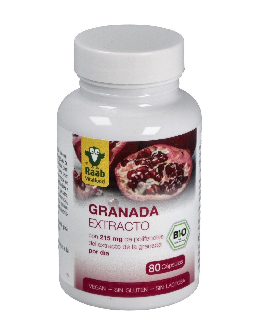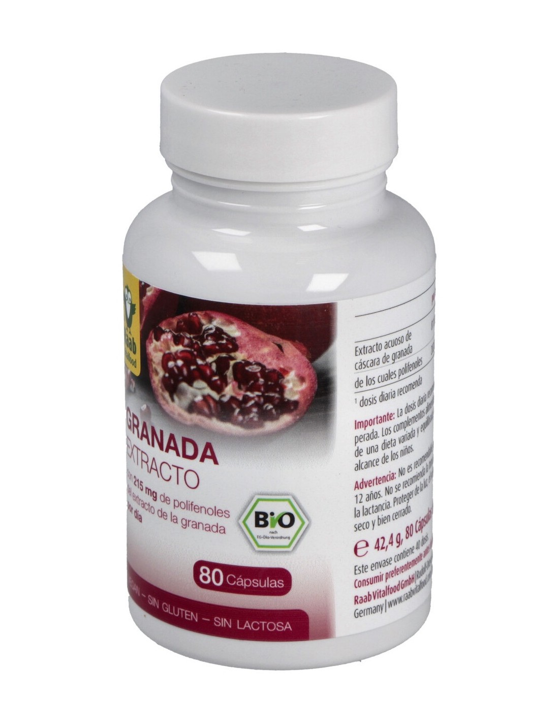 Complemento alimenticio a base de extracto de granada orgánica. Apto para veganos.