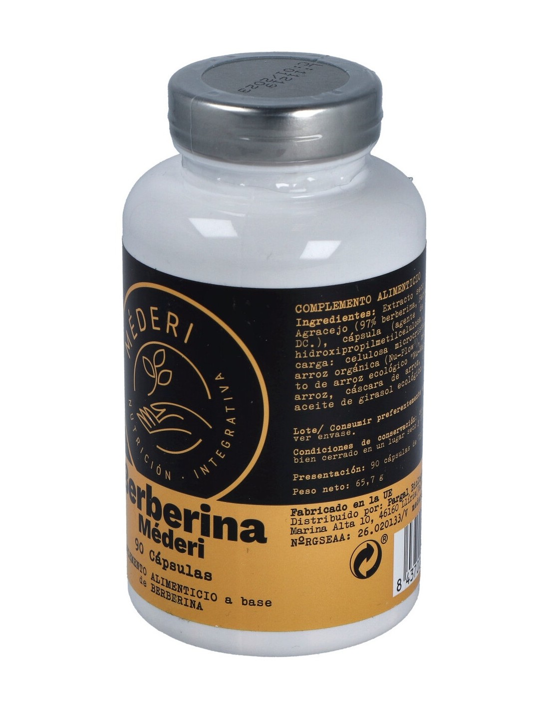 Complemento alimenticio en forma de cápsulas, elaborado a base de extractos secos de berberina, que contribuye a regular el nivel de triglicéridos y colesterol. Ayuda a disminuir también los niveles de testosterona, a reducir la producción de glucosa en sangre, y gracias a sus propiedades antiinflamatorias, contribuye a mejorar los problemas articulares.Usado para completar una dieta sana y un estilo de vida saludable, puede contribuir a la pérdida de peso.