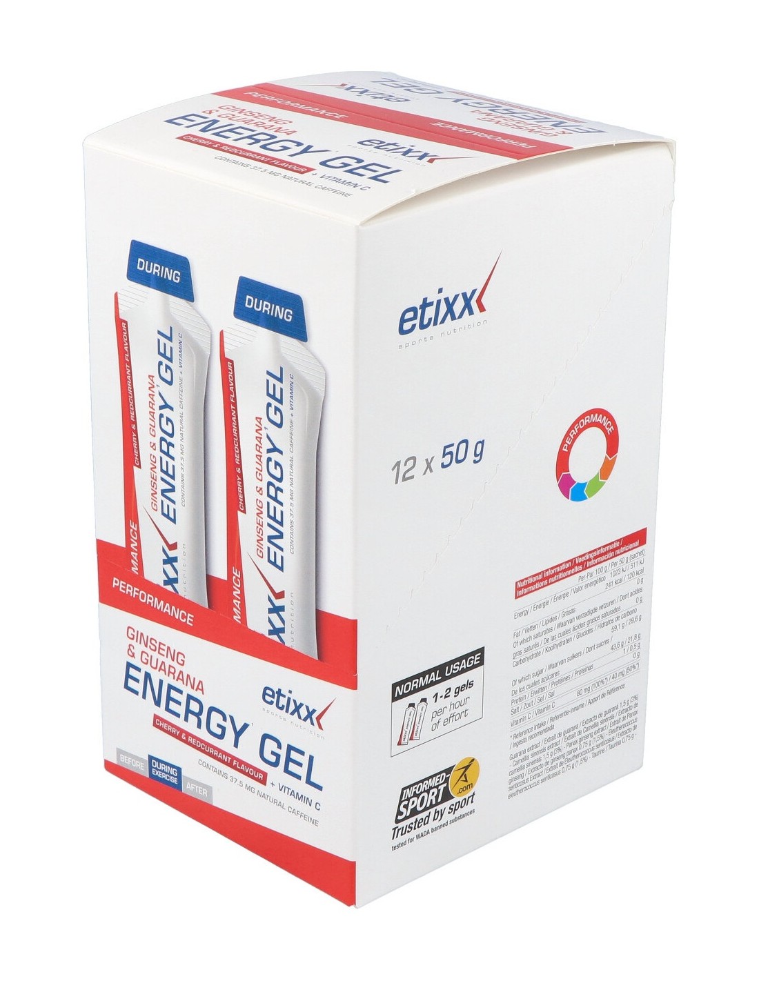 arabe de azúcar 32 g (dextrosa 8% / sucrosa 55% / maltosa 6% / otros azúcares 31%) – agua - dextrosa 6 g – extracto líquido de semilla de guaraná (Paullinia cupana) 1,5 g – extracto líquido de hojas de té verde (Camellia sinensis) 1,5 g (3%) – extracto líquido de raíz de ginseng (Panax ginseng) 0,75 g (1,5%) – extracto líquido de raíz de ginseng siberiano (Eleutherococcus senticosus) 0,75 g (1.5%) – taurina 0,75 g – conservante: sorbato potásico – aroma de grosellas rojas/cereza