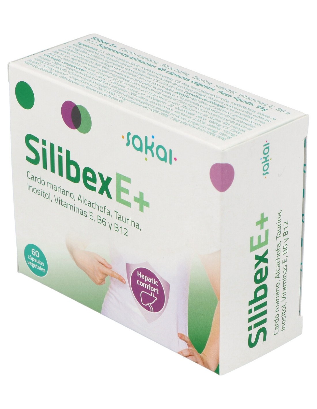 Sakai Silibex E+ 60cáps es un complemento alimenticio a base de cardo mariano, alcachofa, taurina, inositol, vitaminas E, B6 y B12 que protege la funcion hepática.