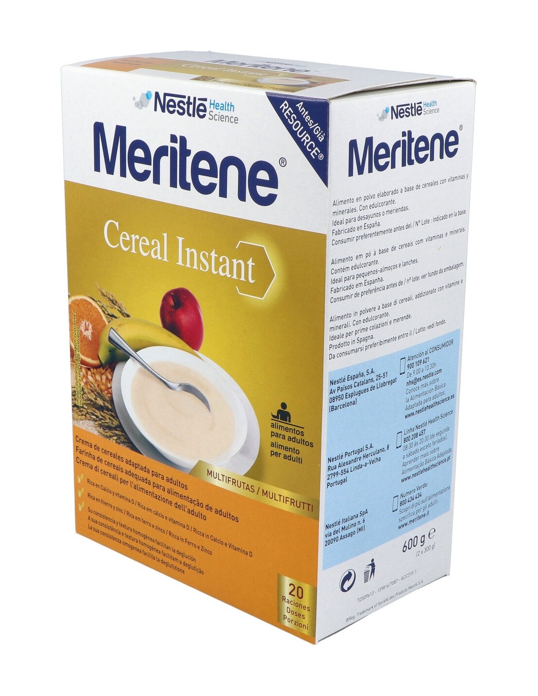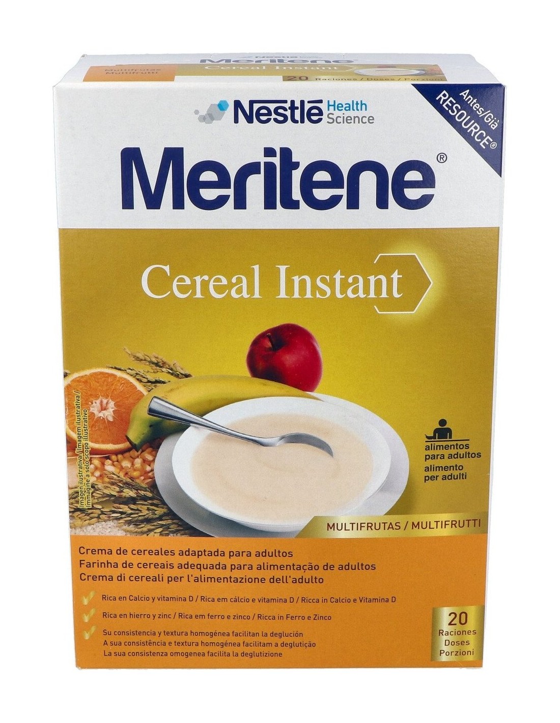 Harinas hidrolizadas (90%) (arroz, maíz y almidón de tapioca), frutas deshidratadas (5%) (plátano, manzana y naranja), minerales (fosfato cálcico, sulfato de zinc, hierro), proteínas de leche, aroma, maltodextrina, vitaminas (L-ascorbato sódico, nicotinamida, acetato de DL-alfa-tocoferilo, D-pantotenato cálcico, riboflavina, clorhidrato de piridoxina, clorhidrato de tiamina, acetato de retinilo, ácido pteroilmonoglutámico, D-biotina, colecalciferol, cianocobalamina), inositol y edulcorante (acesulfamo k).