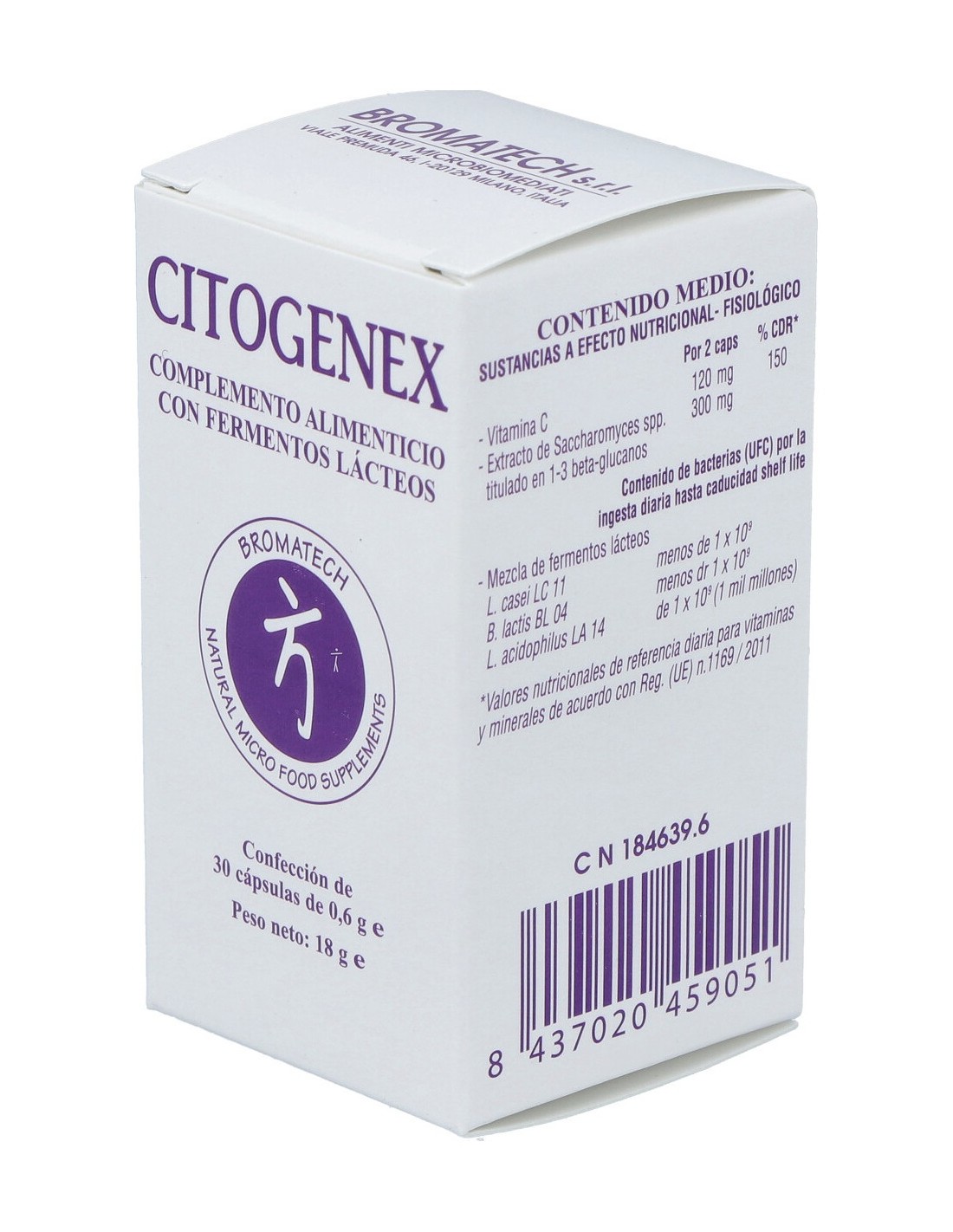 Maltodextrina de maíz, ext, de saccharomyces spp. titulada en 1-3 beta-glucanos, gelatina (cápsula), ascorbato de calcio (vitamina C), mexcla de fermentos lácteos (lactobacillus casei LC 11, lactobacillus acidophilus LA 14 e bifidobacterium lactis BL 04), agente de carga: celulosa microcristalina, antiaglomerantes: sales de magnesio de los ácidos grasos, dióxido de silicio.