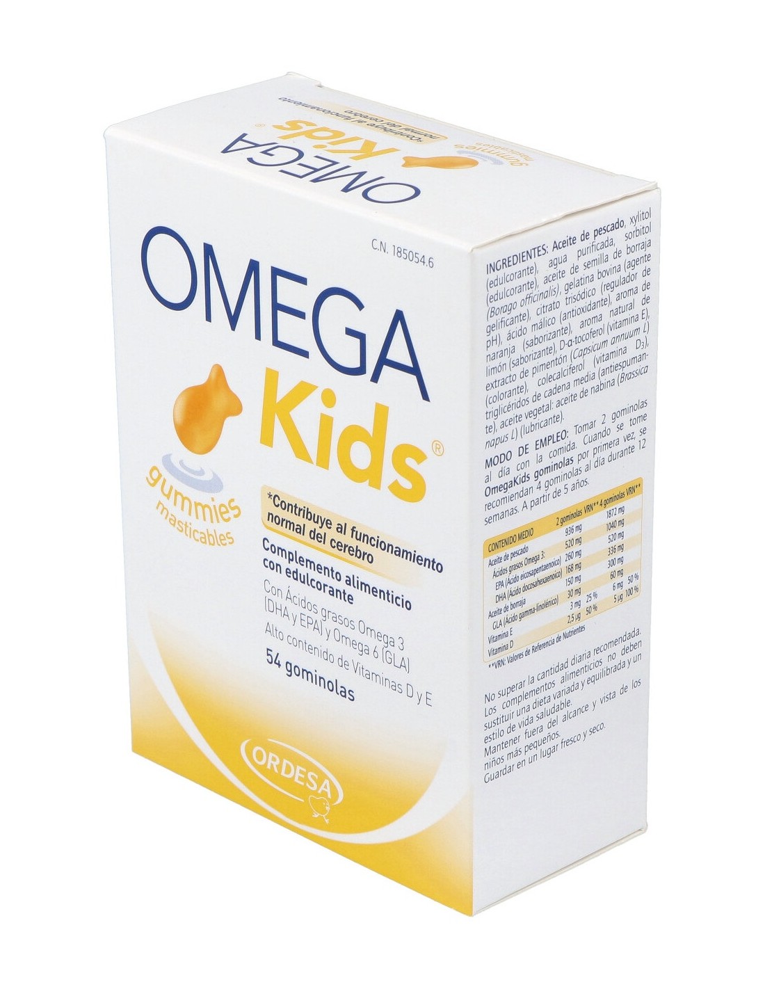 Aceite de pescado, xilitol (edulcorante), agua purificada, sorbitol (edulcorante), aceite de semilla de borraja (Borago officinalis), gelatina bovina (agente gelificante), citrato trisódico (regulador de pH), ácido málico (antioxidante), aroma de naranja (saborizante), aroma natural de limón (saborizante), D-a-tocoferol (vitamina E), extracto de pimentón (Capsicum annuum L) (colorante), colecalciferol (vitamina D3 ), triglicéridos de cadena media (antiespumante), aceite vegetal: aceite de nabina (Brassica napus L) (lubricante).