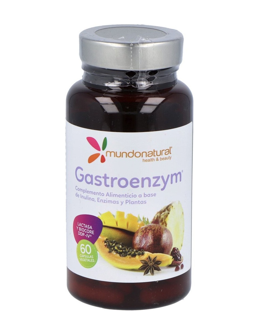 Por 2 cápsulas: Inulina 200 mg, Biocore DDP-IV® (Dipeptidil peptidasa-4) 100 mg, Digezyme® (Amilasa, Proteasa, Celulasa, Lactasa y Lipasa) 100 mg, Papaína 100 mg, Zumo concentrado en polvo de Piña (Ananas comosus (L.) Merr.) 100 mg, Maltodextrina, Bromelaína 50 mg, Lactasa 50 mg, Antiaglomerante (Estearato de magnesio), Extracto seco de Papaya 40:1 (Carica papaya L. 2% Papaína) 20 mg, Antiaglomerante (Dióxido de silicio) y Tripsina 10 mg, Cápsula vegetal (Agente de recubrimiento (Hidroxipropilmetilcelulosa)).