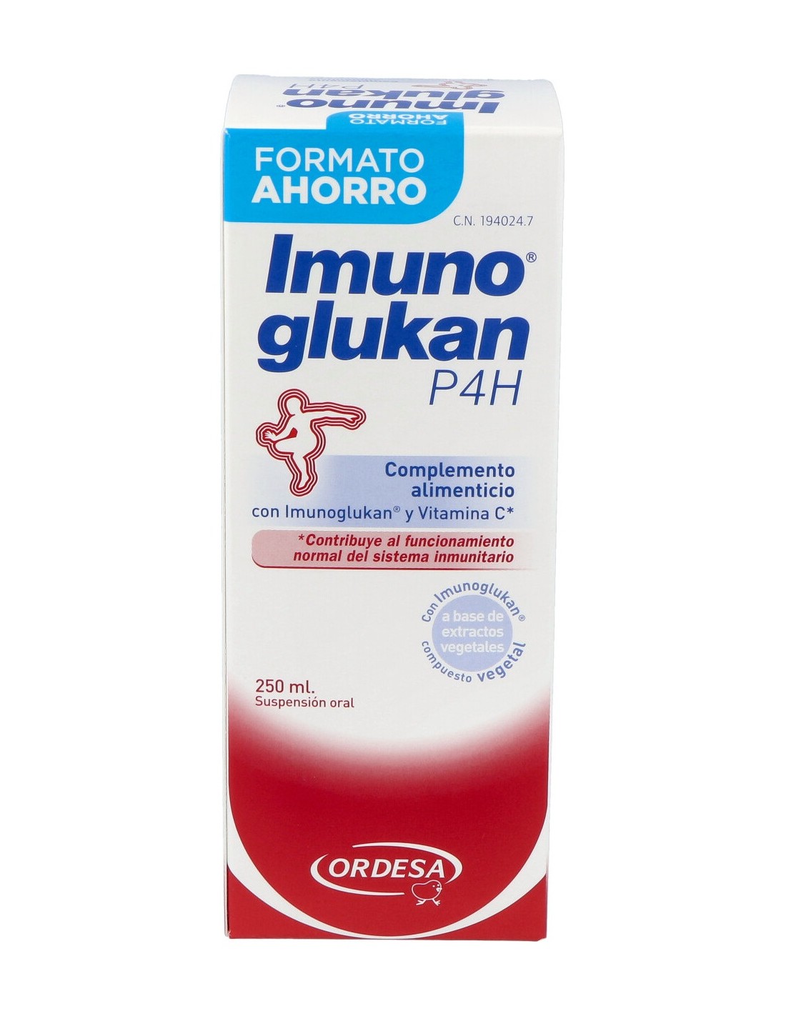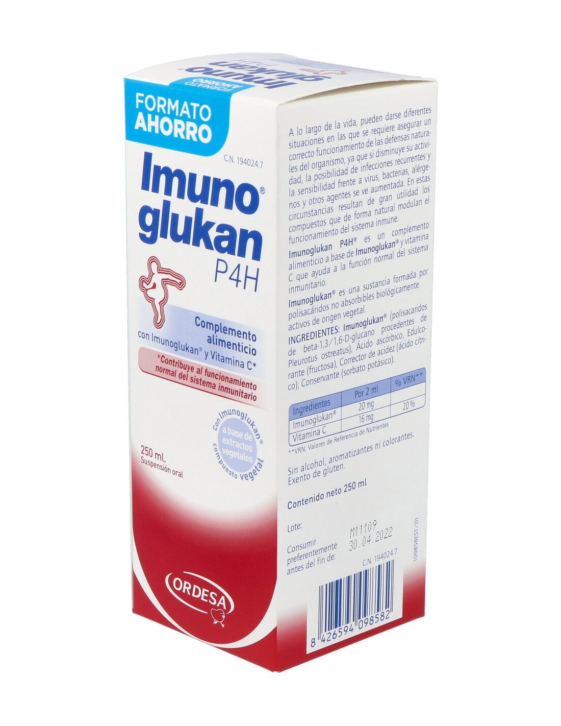 Imunoglukan® (polisacaridos de beta-1,3/1,6-D-glucano procedentes de Pleurotus ostreatus), Ácido ascórbico, Fructosa (edulcorante), Ácido cítrico (corrector de acidez), Sorbato potásico (conservante).