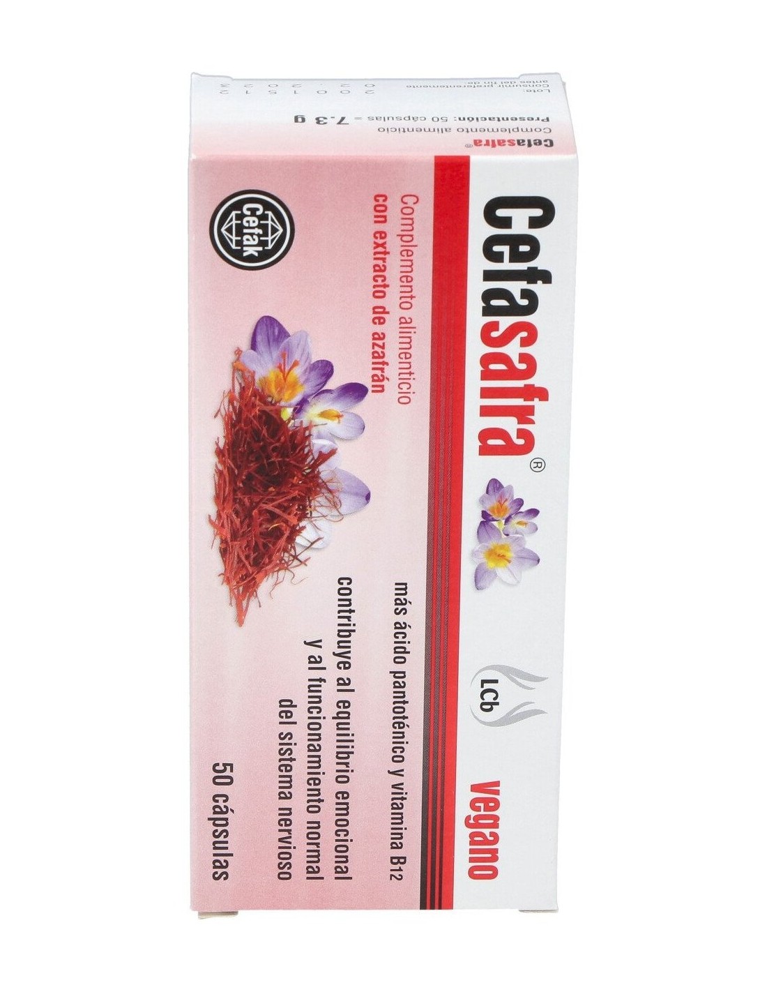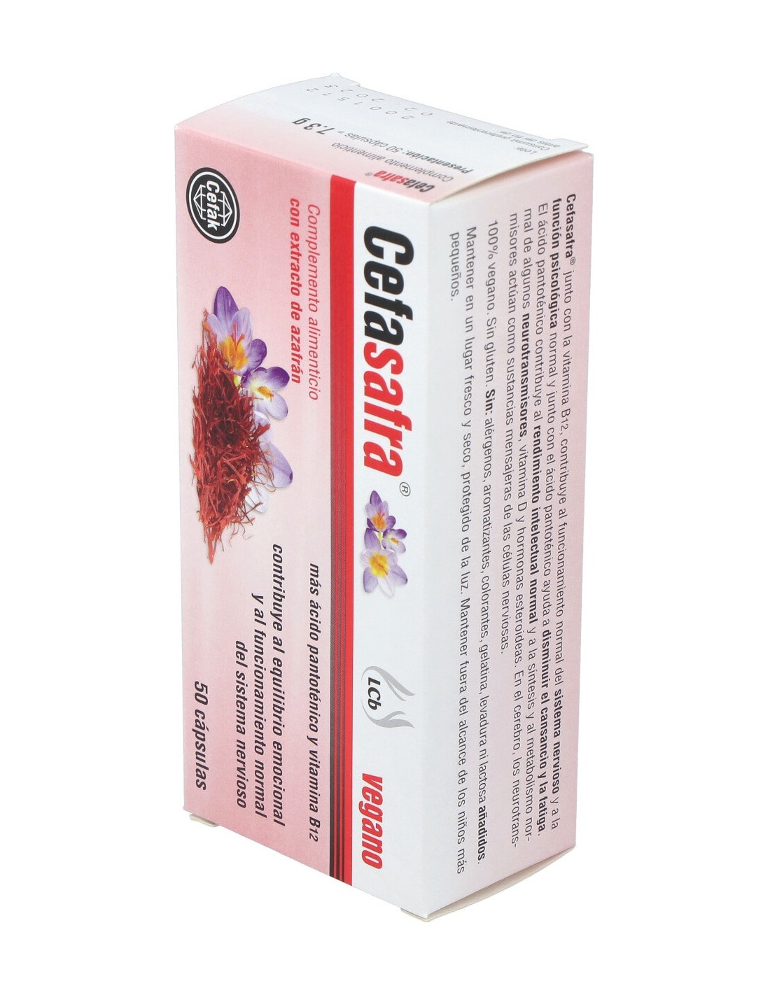 Este producto de la marca Cefak es un complemento alimenticio en forma de cápsulas que beneficia a personas que presentan estados de ánimo alterados. Los componentes de estas cápsulas son: D-pantotenato cálcico, extracto de azafrán, maltodextrina, extracto de arroz, aceite vegetal y vitamina B. Todos ellos contribuyen al funcionamiento equilibrado del sistema nervioso. La cubierta de las cápsulas está hecha de ingredientes específicos que ayudan a evitar o mitigar posibles molestias estomacales.