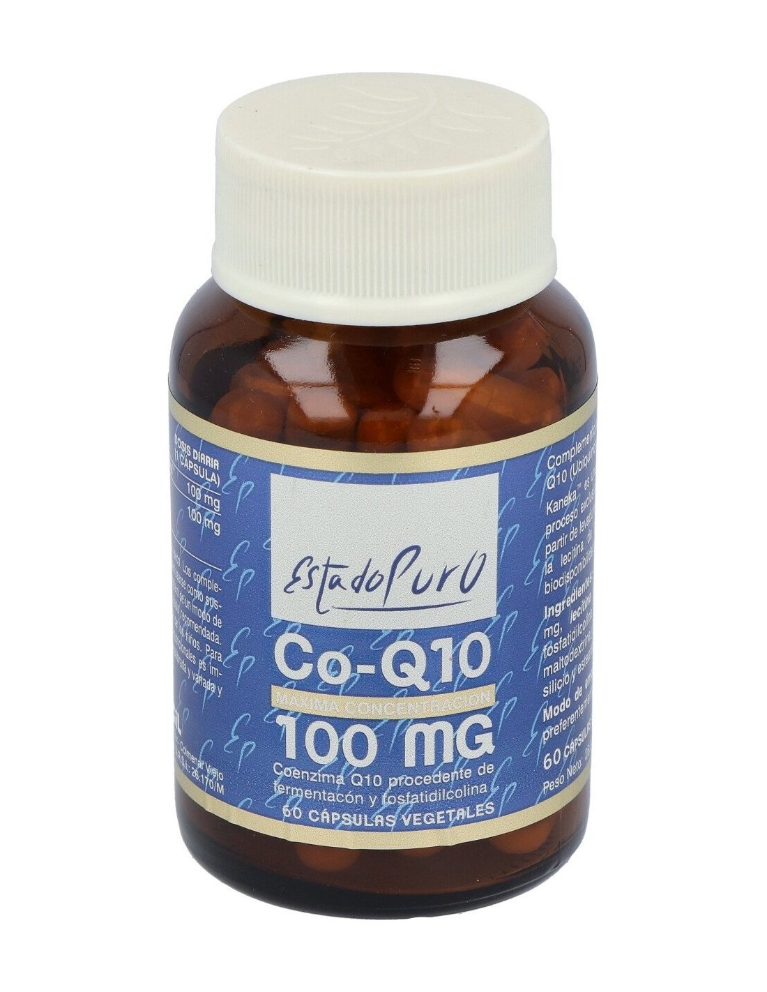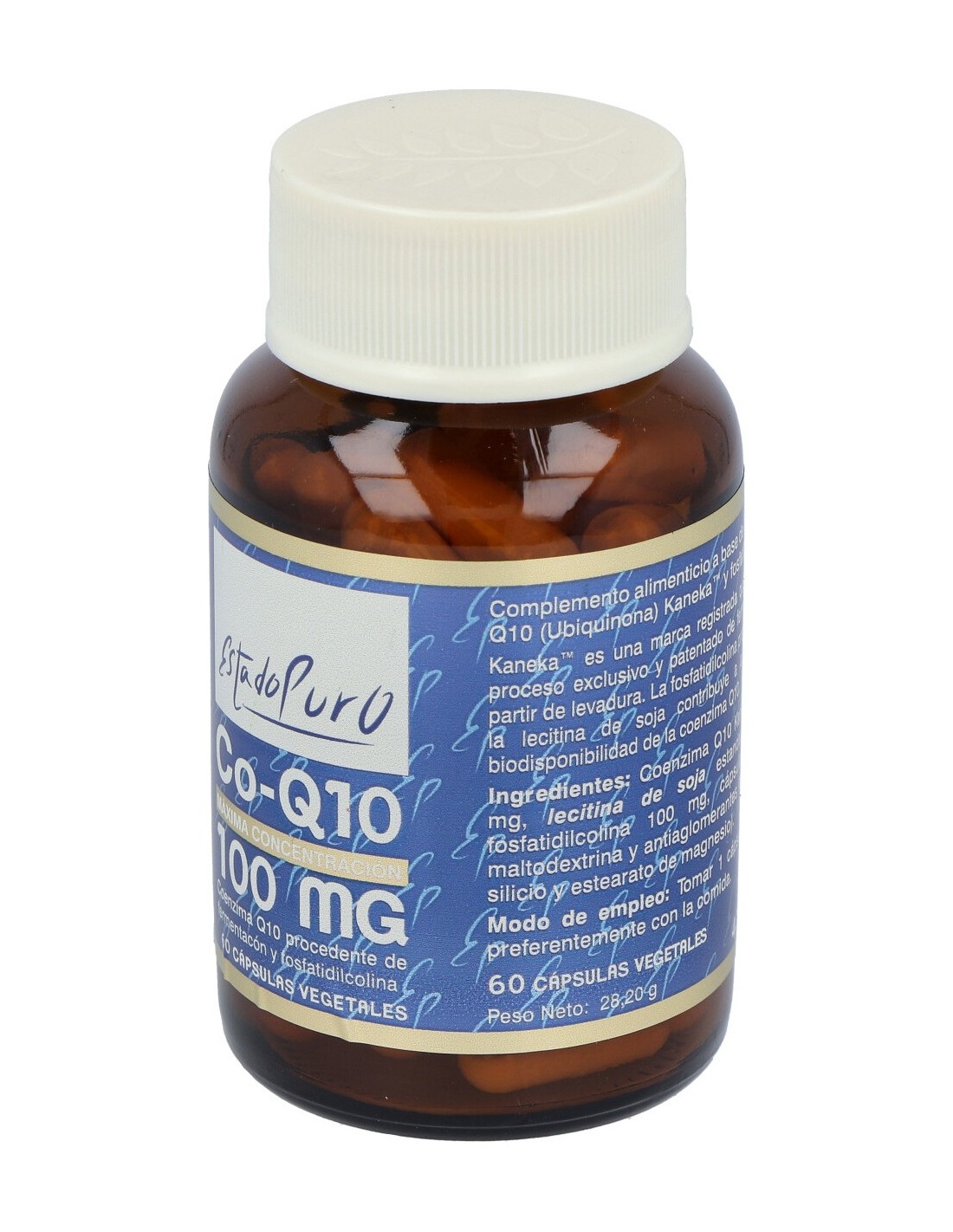 Coenzima Q10 Kaneka™, Lecitina de Soja estandarizada en fosfatidilcolina. Cápsula vegetal, antiaglomerante (dióxido de silicio) y diluyentes (maltodextrina y estearato de magnesio).